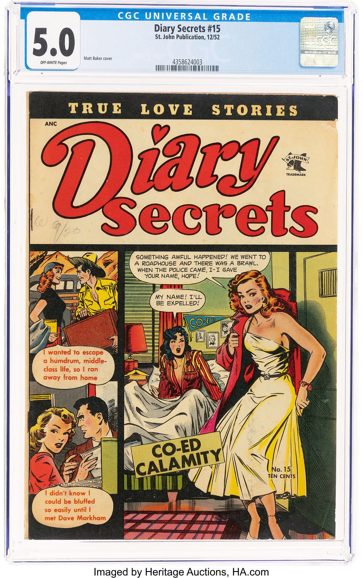 The post-World War II era was marked by a range of new challenges which were reflected in comic books and the broader American culture. The Second Red Scare began to take root under the influence of Senator Joseph McCarthy, as Americans were told that subversive Communist influences could be lurking anywhere, even in the sprawling federal bureaucracy of Washington, DC. Meanwhile, moral panic over various perceived declines of traditional values increased such national anxieties. Popular music, comic books, and even the rising post-war independence of young women were all viewed as threats to the social order of the era. Two of Diary Secrets #15's stories are heavily influenced by such issues. "I Couldn't Say No" is a reflection of the Red Scare consuming the nation's capital at that time. It's a cautionary tale in which the romantic indiscretion of a "government girl" becomes a matter of national security. The story "Co-Ed Calamity" tells a more traditional tale about the expected moral codes for young women, dramatizing how a single misstep, or even the accusation of one, can lead to social and academic ruin. An underappreciated St. John romance comic book with cover and art by Matt Baker, there's a CGC VG/FN 5.0 Off-white pages copy of Diary Secrets #15 (St. John, 1952) up for auction in the 2025 October 16 Golden Age Comics Century Showcase Auction III at Heritage Auctions.