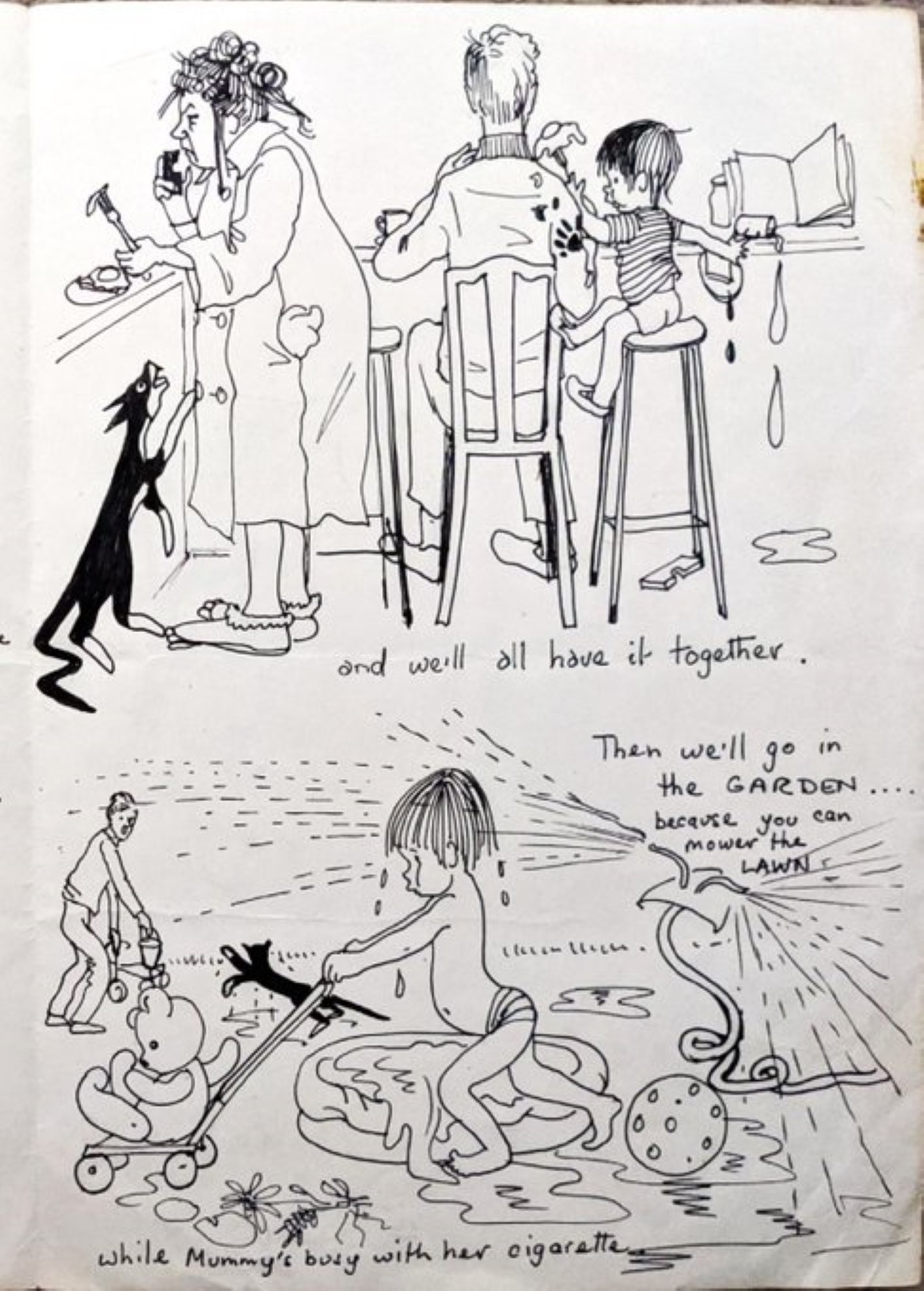 In 1978, my Dad had a heart attack. But by 1981 they'd both recovered from their respective near-death experiences and we had our first family package holiday abroad, to run-down apartments in Corfu with friends. Here are some pages from a cartoon book she made about it…