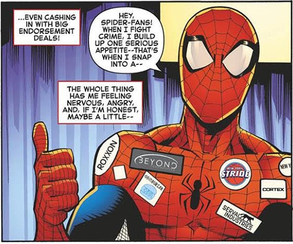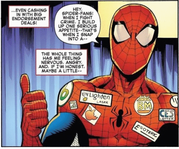 Marvel has now told the Hollywood Reporter that the artwork has been changed on the digital version of the comic and on the upcoming second printing. And to be on the safe side, his other invented logos for a Spider-Man who is taking sponsored messaged, have also been changed to Marvel fictional companies. Here is the original