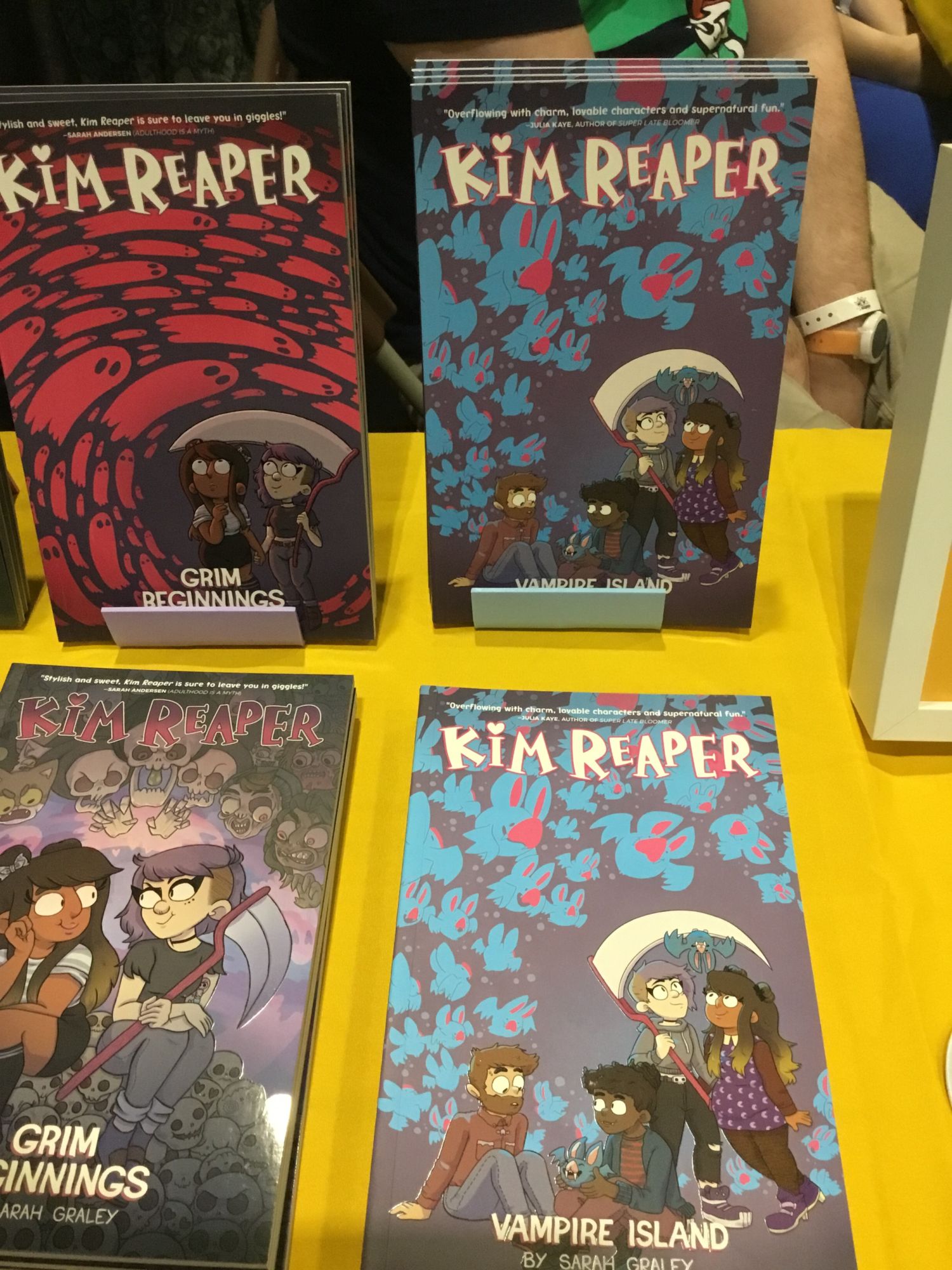 You may have figured out that I'm on MCM London Comic Con this long weekend, scouring the Comic Village for any stories I can pick up. Well I was very happy to pop by Sarah Grayley's booth to discover that she has released a new Kim Reaper graphic novel, Vampire Island, a little earlier especially for the show. As well as promoting the recently launched Glitch, this is currently the only place you can find it… along with everything else she's brought along. Bookstores will get Vampire Island in the second week of June… so not too long for everyone else to wait.