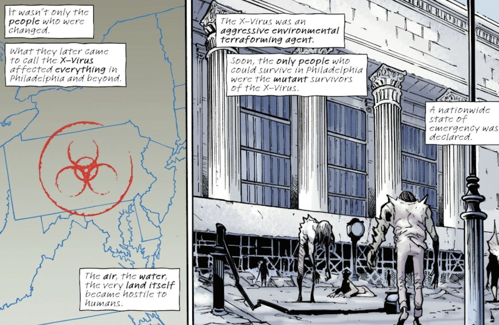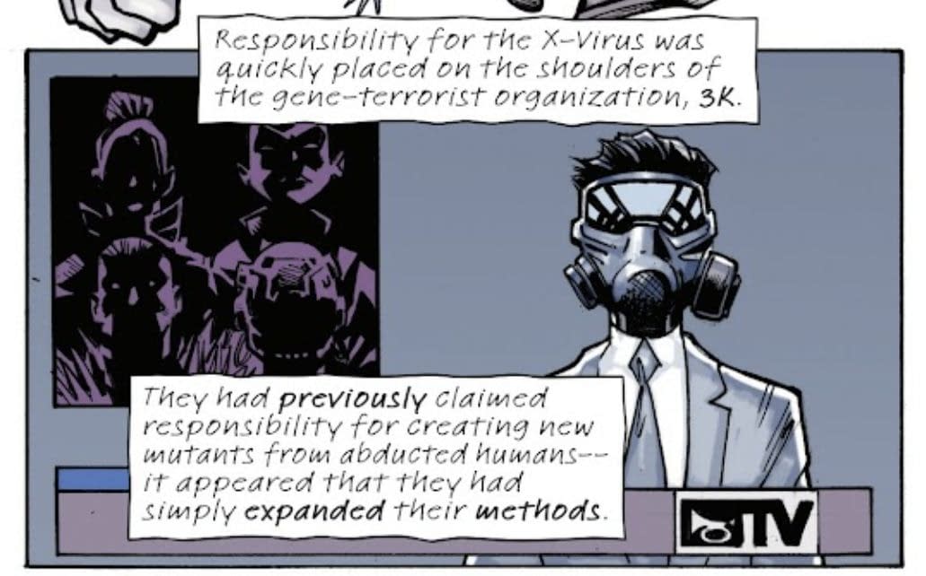 This future is now known by Scott Summers, Cyclops, leader of the X-Men, and the Krakoan Hank McCoy, the mad scientist version of The Beast, the Chairman of the mutant terrorist group, 3K. And now they actually want to release the X-Virus for real this time, but use it for their own ends, rather than be blindsided. "3K prepare to unleash a virus that will forcibly. and horribly. transform humanity into mutants! This long-seeded plan, built up since the very beginning of MacKay's hit run, hits the Marvel Universe with seismic repercussions that not only impact MacKay's continuing work on the franchise, but upset the very balance between mutantkind and humanity as we know it!"