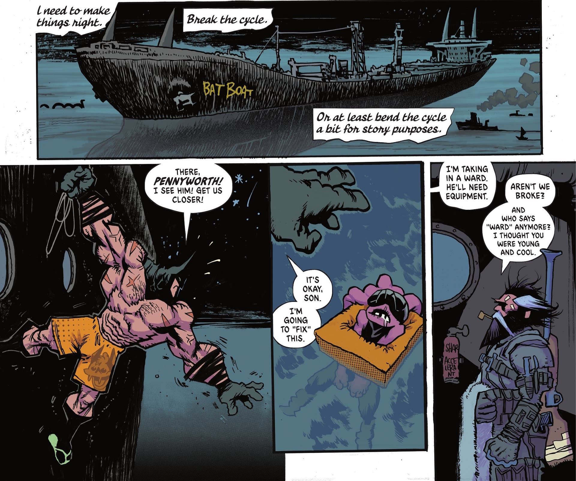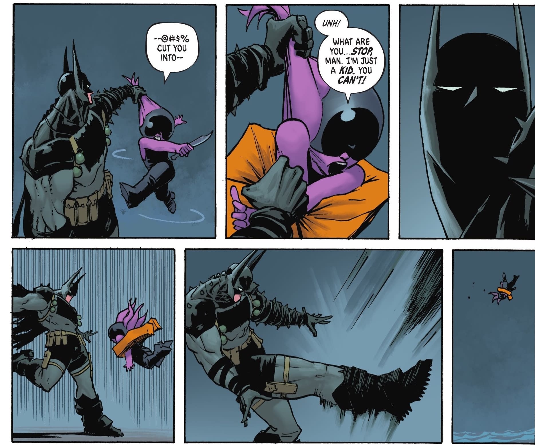 This is the scene from Absolute Batman #6, part of "The Zoo", that kicked off (literally) all sorts of controversy until people got to the page with the Absolute Joker baby suit. Batman punting a kid into the ocean in the fashion of Cerebus Pope.