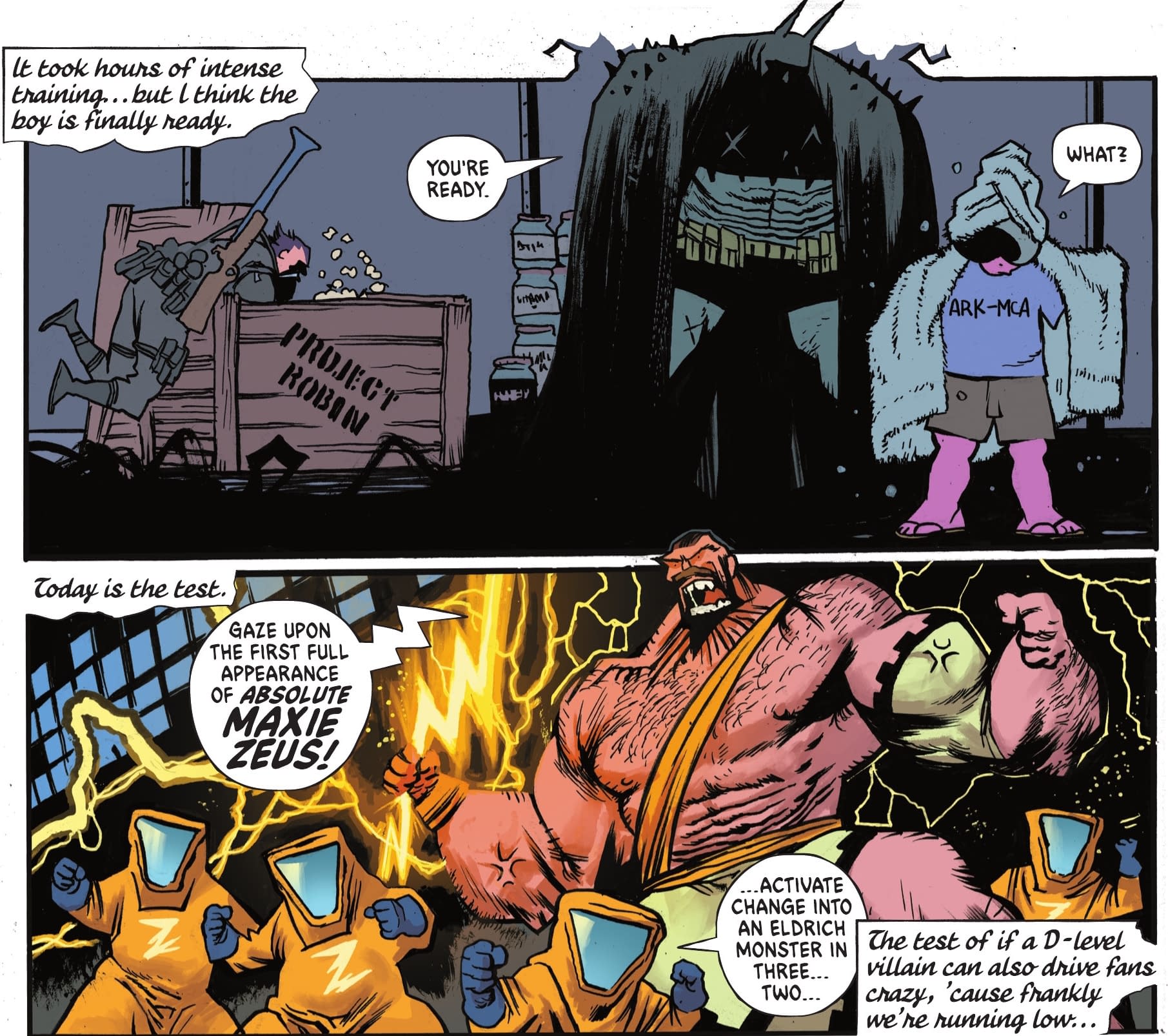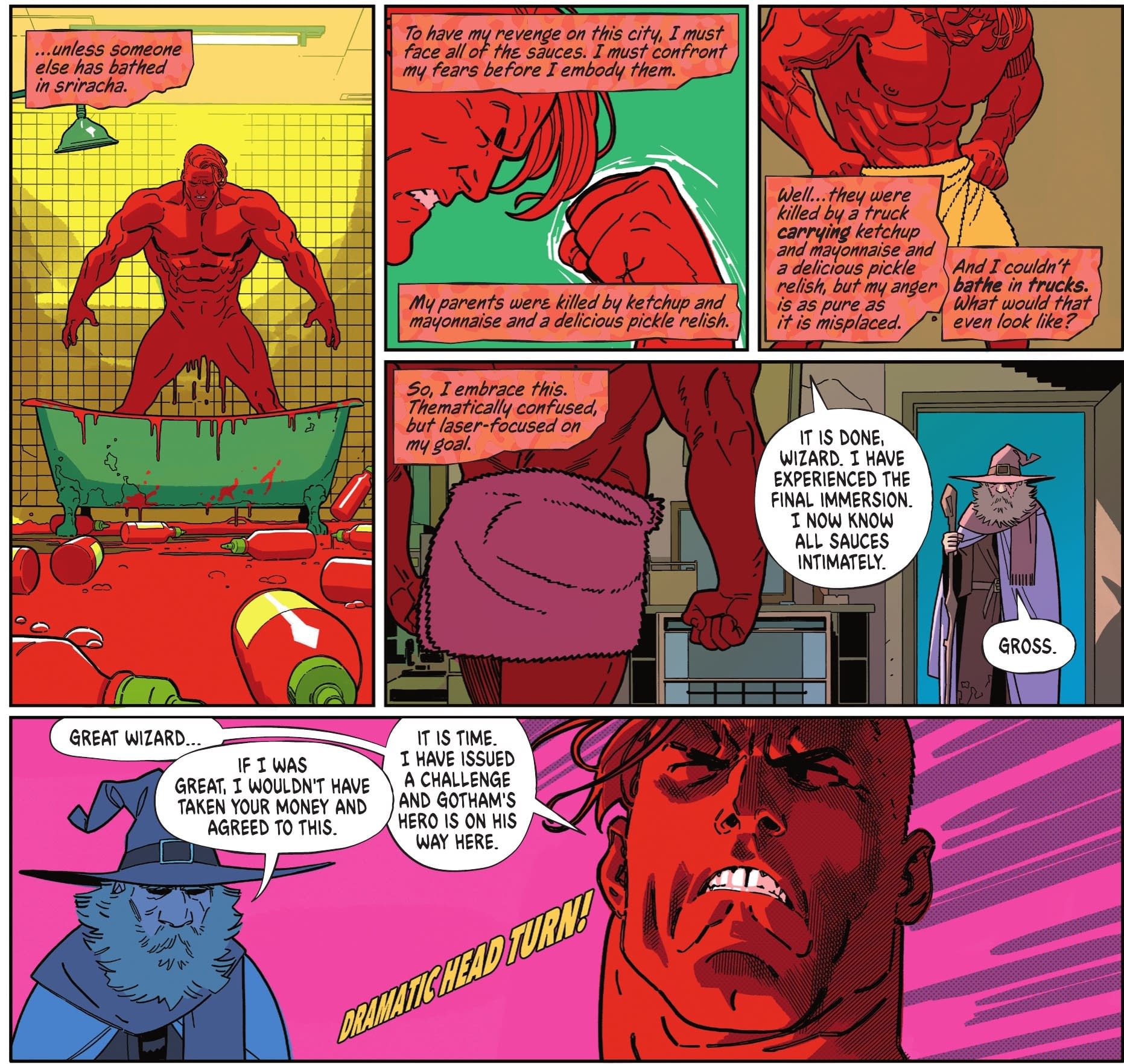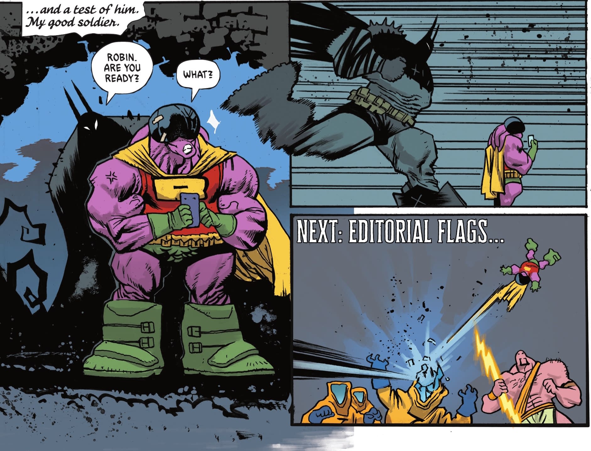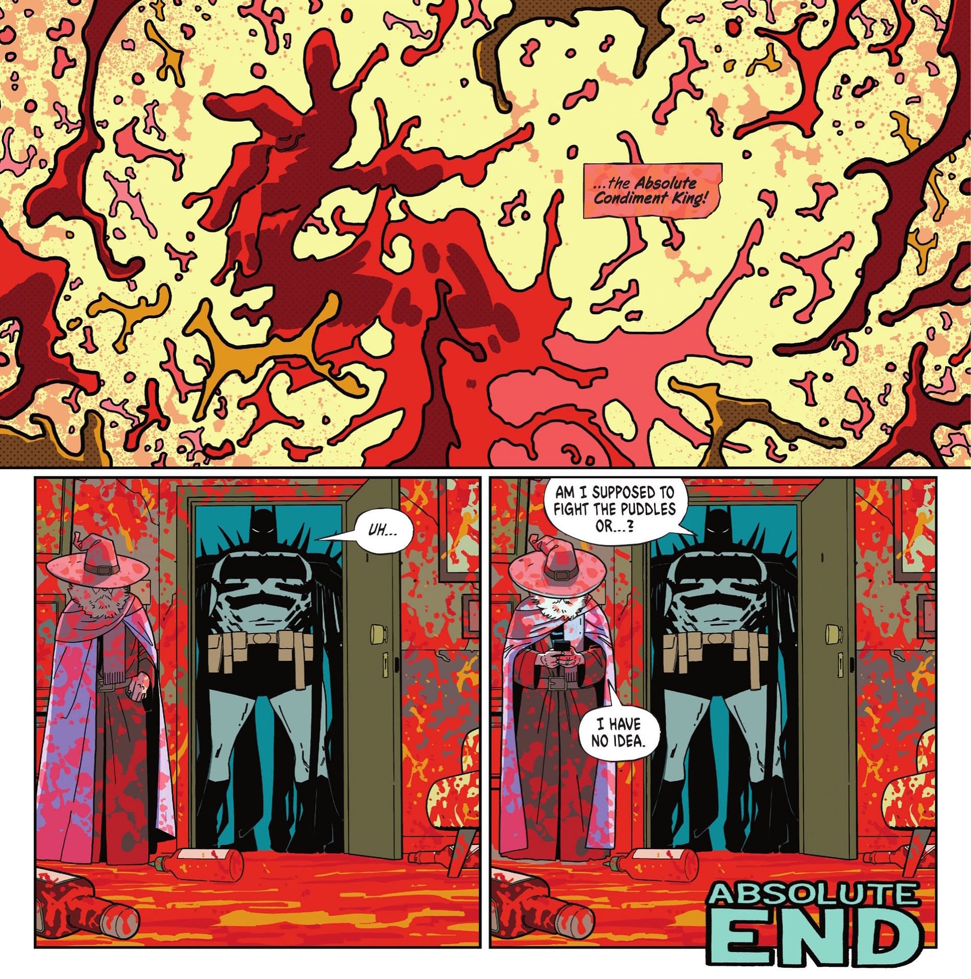 Hey, Maxie Deus isn't *that* D-List! Created by Denny O'Neil and Don Newton for Detective Comics #483 in 1979, a former Greek history teacher who goes insane following the death of his wife, escaped Arkham Asylum to form the Greek mythology-based superteam New Olympians, and turns up in lots of Batman and Robin, rebooted in the New 52 when Deacon Blackfire's ghost possesses Maxie Zeus in an attempt to resurrect himself, he was in cartoons Batman: The Animated Series, The Batman, Harley Quinn, the NES Batman: The Video Game, Batman: Arkham Asylum, Scribblenauts Unmasked and more. He's not the Absolute Condiment King. Anyway, time for this Robin to enter the fray. And Absolute Batman only knows one way.