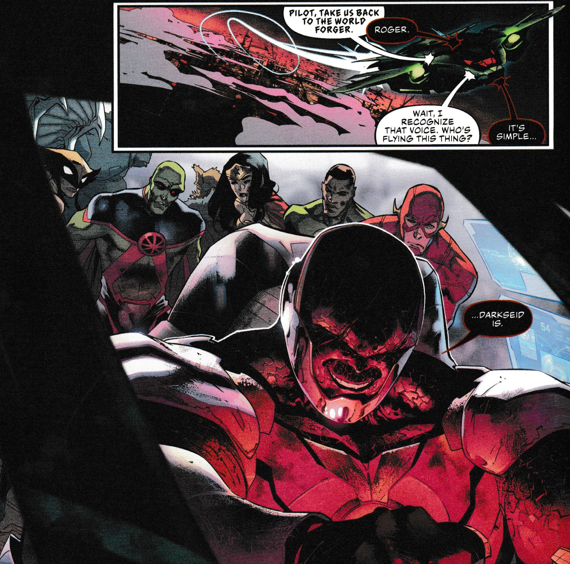 Hilarity from planetary genocide. While over in Justice League #23 by Scott Snyder, Jorge Jimenez, Alejandro Sanchez, Tom Napolitano, Andrew Marino and Marie Javins, the very alive Darkseid is working with the Legion Of Doom to rescue the Justice League from their sixth dimensional future.