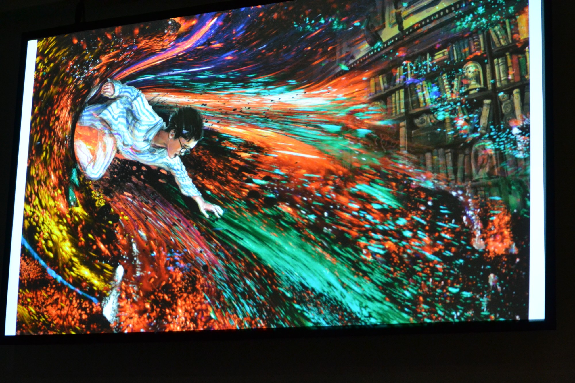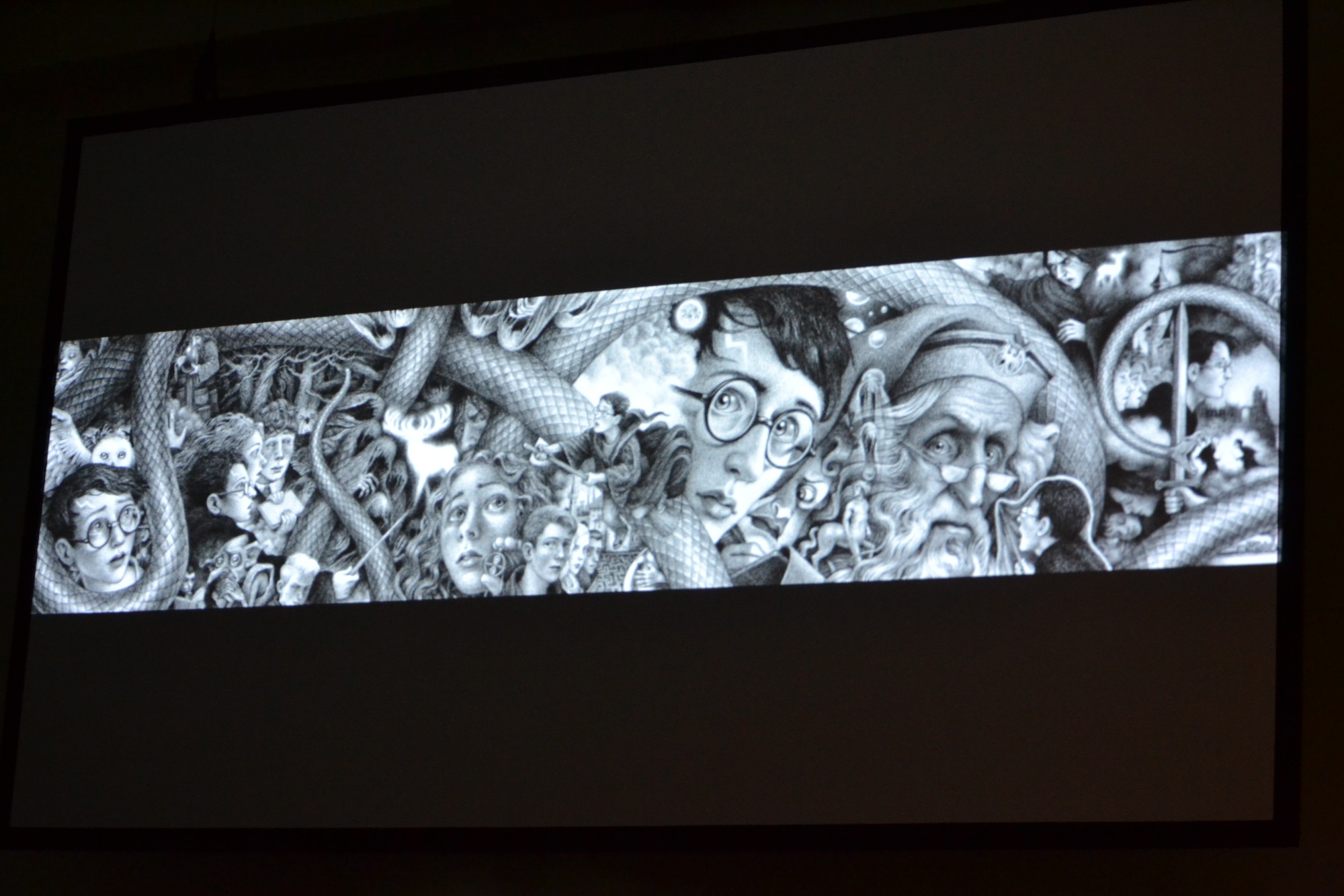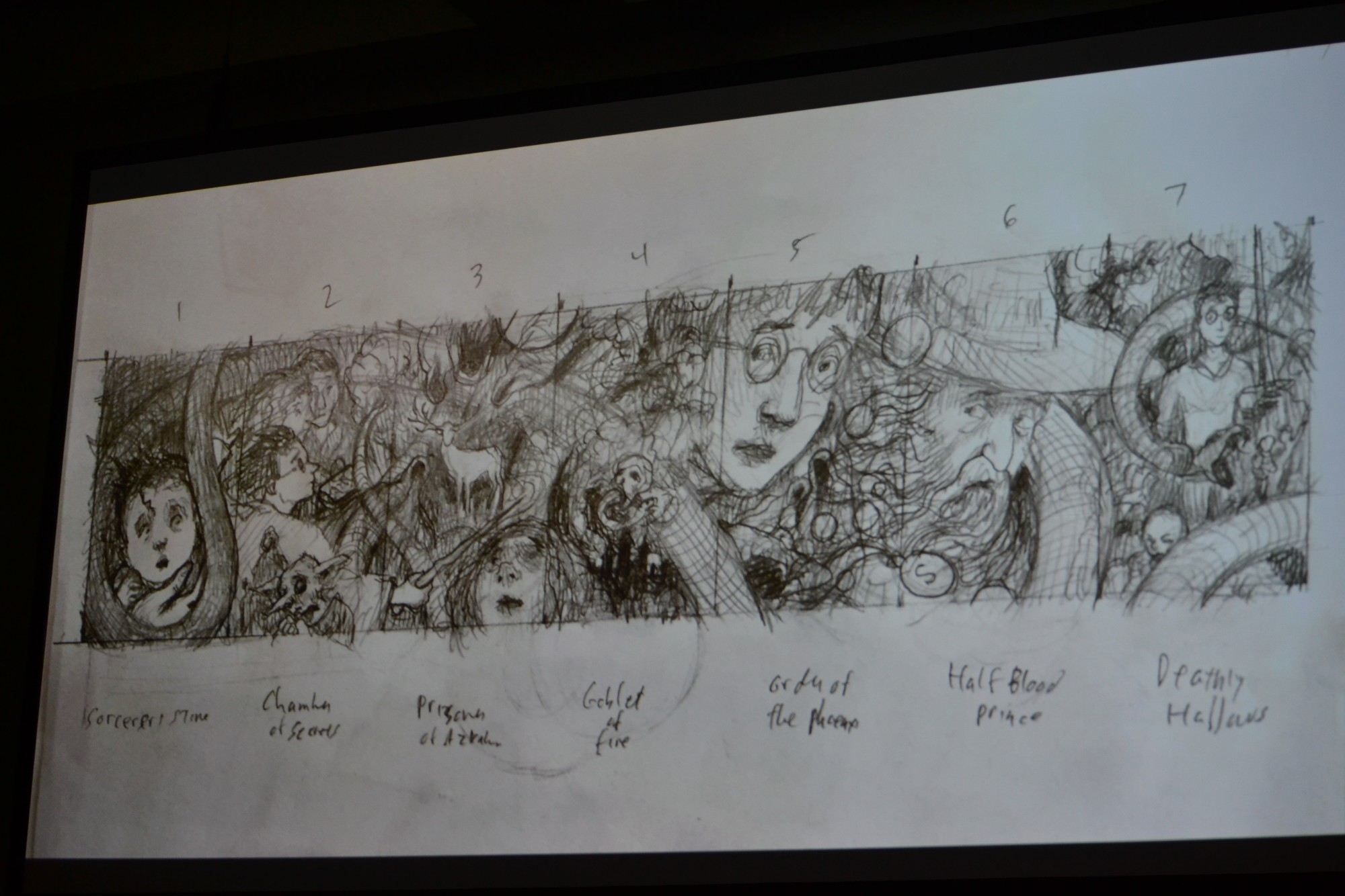 Each illustrator started by showing a slideshow of their work and their artistic process. Kibuishi went first, showing a series of slides that depicted various versions of his Harry Potter covers, culminating in the final product, as well as a gallery quality piece of art for the box the set was sold in. Kibuishi, who is primarily known as an author and illustrator of comics, took on the 15th Anniversary paperback edition cover project while recovering from a major illness. In fact, Kibuishi had suffered from bacterial meningitis that had resulted in him spending time in a coma, and the Harry Potter Anniversary project was his first foray back to work after his illness. As a result, the project acted as art therapy for Kibuishi and he brought his trademark animation-like style to the project and created a new look for the paperback books for a new generation of readers. Interestingly, all of Kazu's art was produced digitally.
