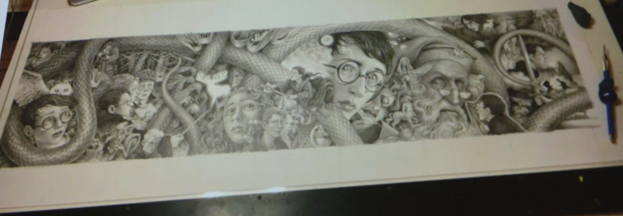Brian Selznick did the cover illustrations for the 20th Anniversary Hardcover Edition of Harry Potter that will be released on August 28, 2018. He said that as soon as he got the call, he knew he wanted to design the seven book covers in such a way that when they are laid out next to each other, in order, they form one long mural that tells the Harry Potter story. He began to design the covers as one long piece of art with the tail of a snake intertwined and linking the seven covers. In fact, the final art was produced as one long piece of art and later divided as the seven covers (and it was all done by hand). The hidden details and small easter eggs that make up the art were impressive (he even used his husband as inspiration for the face of Dolores Umbridge). Selznick also did not shy away from completely diverging from the original series's colorful illustrations, instead doing all of his covers in black and white.