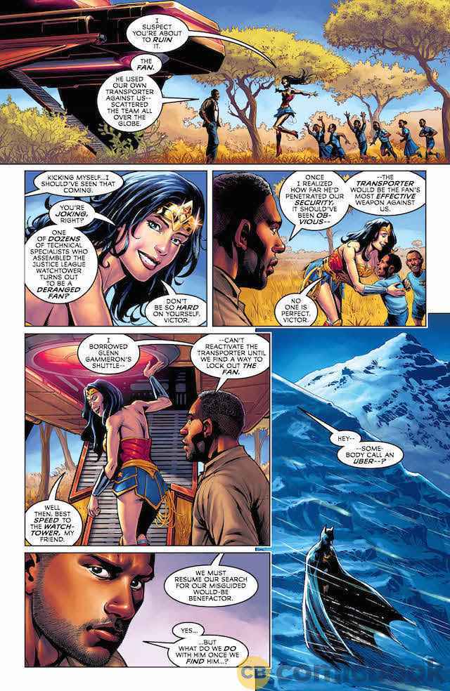 And now, it seems. he is recognised as an enemy of the Justice League. Not a major one, admittedly, but in a conversation between Batman and the Green Lantern Jessica Cruz in tomorrow's Justice League #38, we got this jokey exchange over their latest threat The Fan who wants to help the Justice League, with deadly consequences.