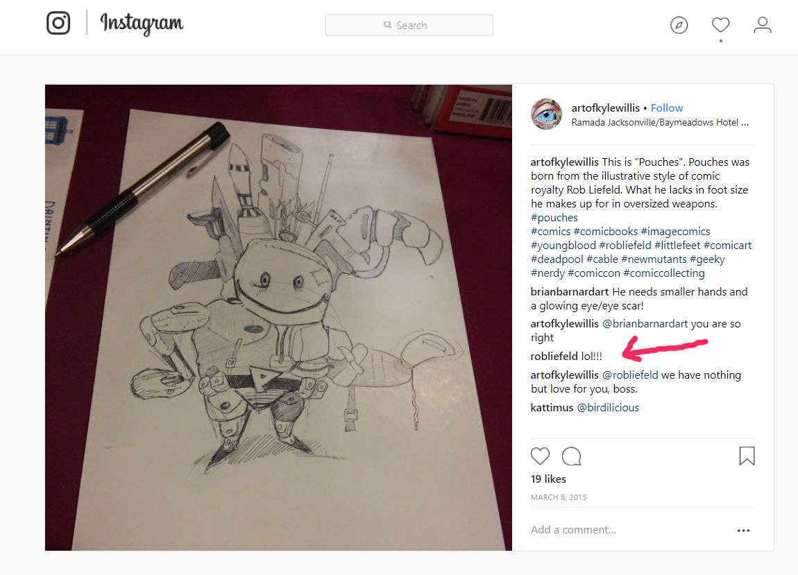 Back in March of 2015, Kyle was at a local comic show set up selling art. The con was slow so he took out one of the cardboard backboards for his prints and started doodling on it. He had just bought a Deadpool figure and it made him smile at the thought of how every character Rob Liefeld drew in the 90's had all these tactical pouches. So he drew a character comprised entirely out of tactical pouches, named him Pouches and posted it to Instagram.