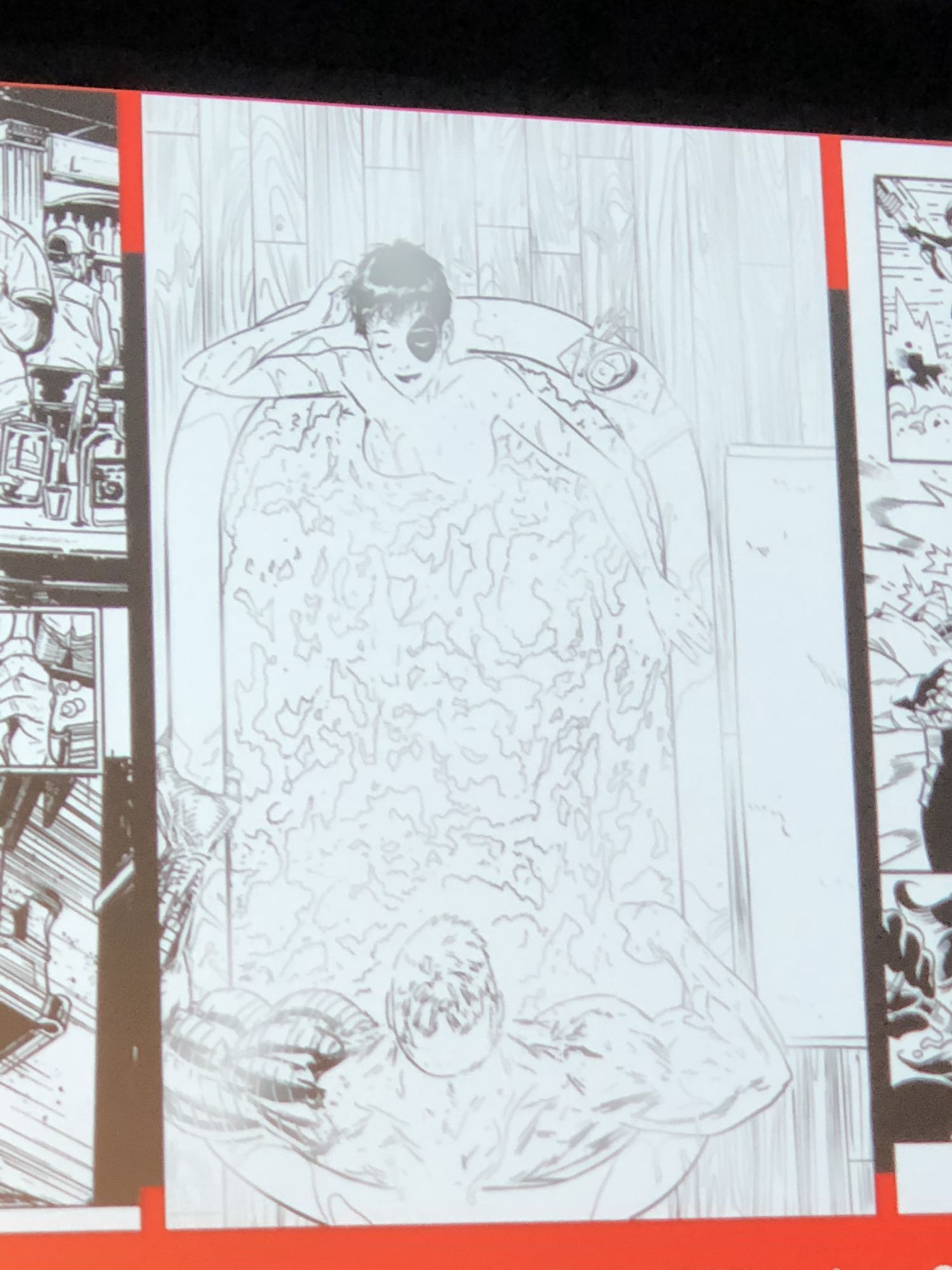 This is one of those famous scenes by the young Rob Liefeld for the comic book New Mutants, back in the day — with Cable and Domino having an end of day relax in a hot bathtub.