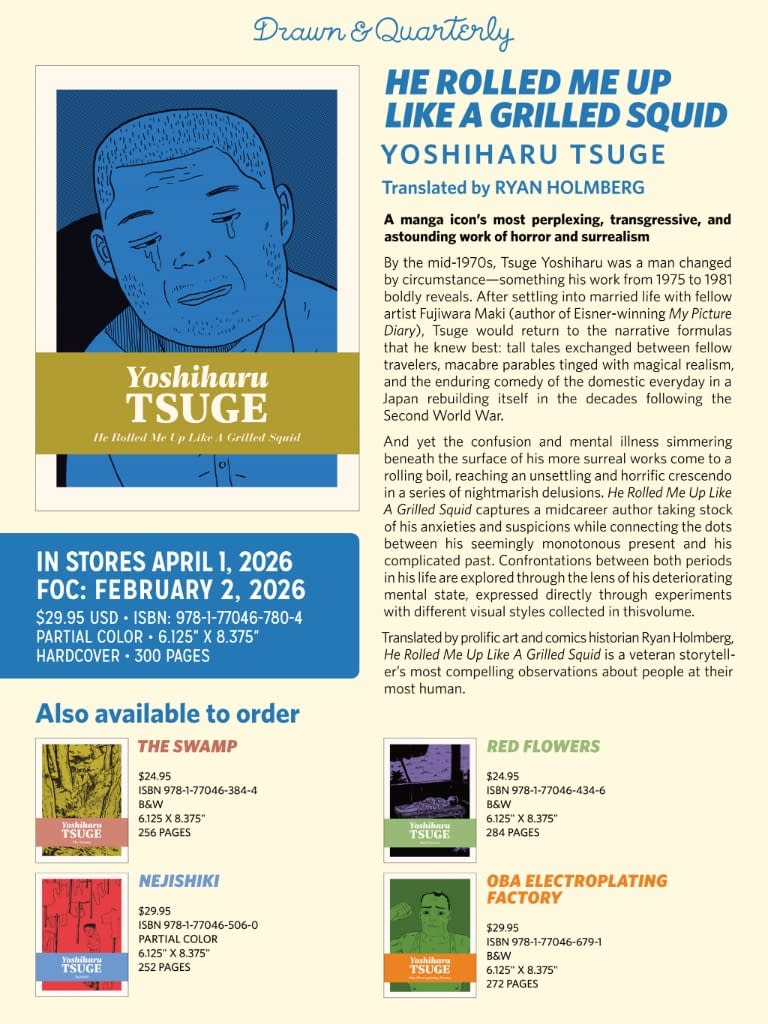 - Drawn & Quarterly April 2026 solicits also feature Yoshiharu Tsuge’s He Rolled Me Up Like A Grilled Squid.