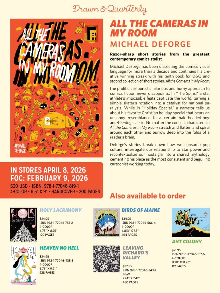 Razor-sharp short stories from the greatest contemporary comics stylist In All the Cameras in My Room, Michael DeForge's hilarious and horny approach to comics fiction never disappoints. In "Figure Skating," a star athlete's impossible feats captivate the world, turning a simple skater's rotation into a catalyst for national paralysis. While in "Holiday Special," a narrator tells us about his favorite Christian holiday special that bears an uncanny resemblance to a certain bald-headed-boy-and-his-dog classic. No matter the conceit, characters in All the Cameras in My Room stretch and flatten and spiral around each other and burrow deep into the folds of a reader's brain. $30.00 4/8/2026