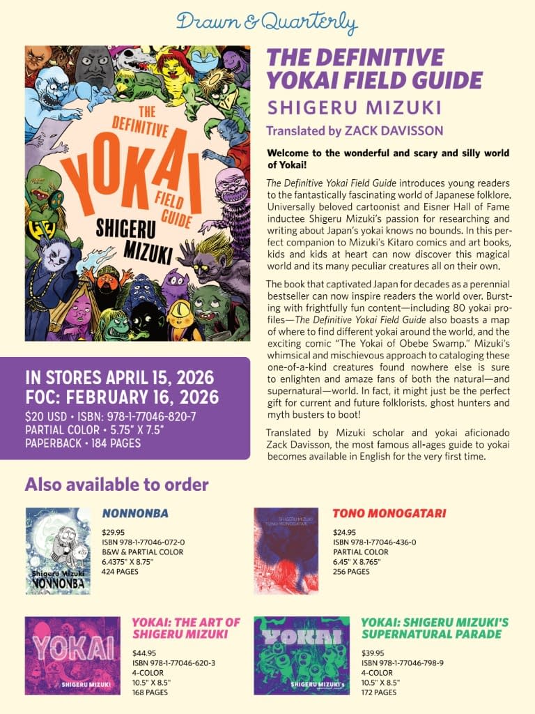 Welcome to the wonderful and scary and silly world of Yokai! The Definitive Yokai Field Guide introduces young readers to the fantastically fascinating world of Japanese folklore. Universally beloved cartoonist and Eisner Hall of Fame inductee Shigeru Mizuki's passion for researching and writing about Japan's yokai knows no bounds. In this perfect companion to Mizuki's Kitaro comics and art books, kids and kids at heart can now discover this magical world and its many peculiar creatures all on their own. Translated by Mizuki scholar and yokai aficionado Zack Davisson, the most famous all-ages guide to yokai becomes available in English for the very first time. $20 4/15/2026