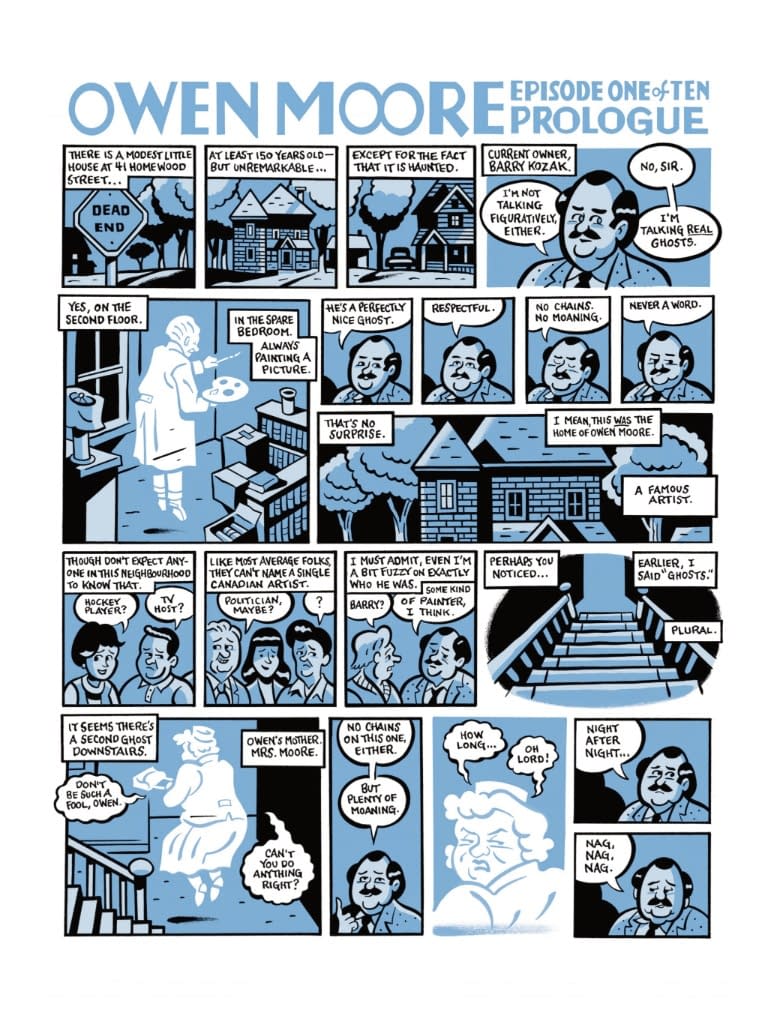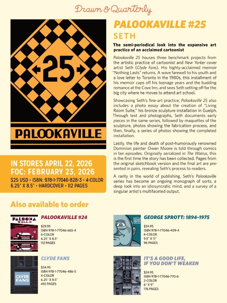 The semi-periodical look into the expansive art practice of an acclaimed cartoonist Palookaville 25 houses benchmark projects from the artistic practice of cartoonist and New Yorker cover artist Seth (Clyde Fans). His highly-acclaimed memoir "Nothing Lasts" returns. A wave farewell to his youth and a love letter to Toronto in the 1980s, this installment of his memoir caps off his teenage years and the budding romance at the Cove Inn, and sees Seth setting off for the big city where he moves to attend art school.The life and death of post-humorously renowned Dominion painter Owen Moore is told through comics in ten episodes. Originally serialized in The Walrus, this is the first time the story has been collected. Pages from the original sketchbook version and the final art are presented in pairs, revealing Seth's process to readers. $25 4/22/2026