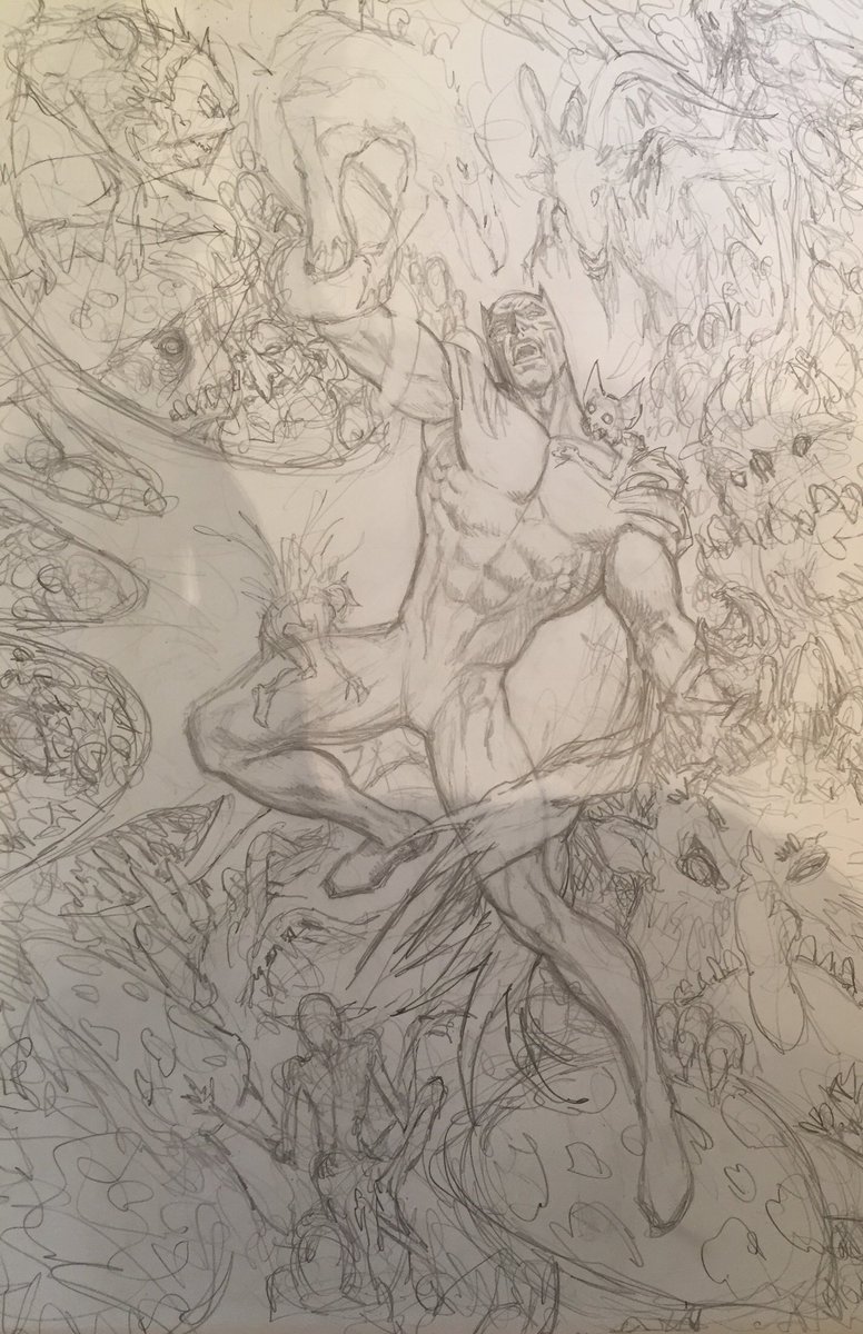 Liam also had time to post some progress art showing his work on a pretty crazy page featuring Batman. You can see where he stresses the detail in his pencils and where he leaves some of those details to be doing in the inking stage, like the actual pieces of Batman's costume.