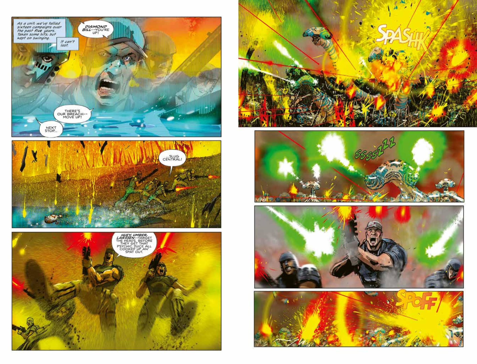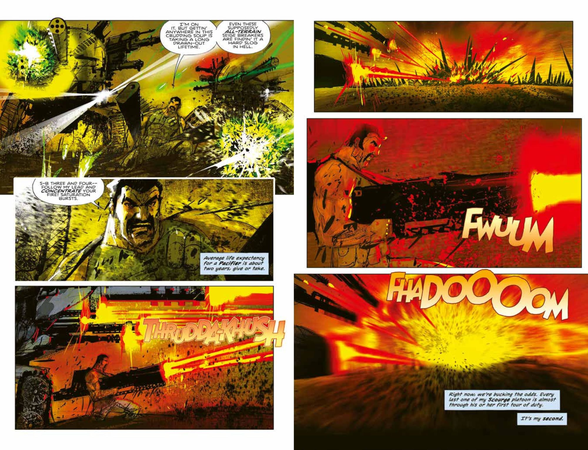 The comic To The Death sees career soldier Aleksy Dryagin returns from off-world wars to find that putting down his guns and picking up where he left off with his wife and young son is not an option. Instead, he's marked for death, the pawn in a power struggle between the omnipotent Tri-Corp and subversive organization White Noise. But Dryagin is no one's pawn. You pick a fight with Dryagin… It's To The Death. Populated with colourful characters – such as evolved fish-man Killatoa, The Triumvirate, and Dryagin's crack Scourge platoon of 'Pacifiers', To The Death is widescreen kinetic action all the way, building to a truly Earth-shattering conclusion.