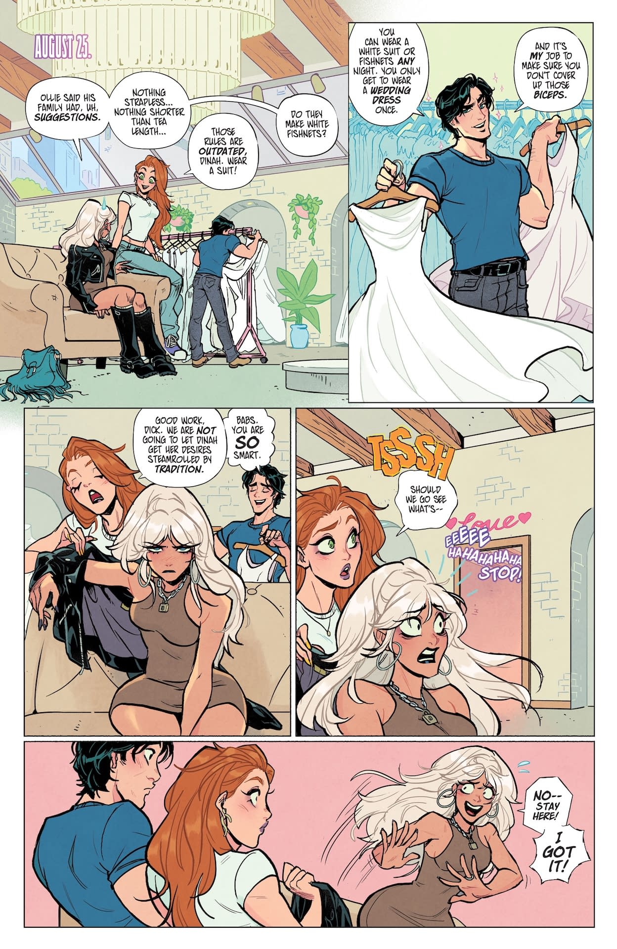 Ah, "steamy surveillance work" with Batman and Catwoman! LOLtron calculates an 87.3% probability that this involves more than just binoculars and notepads. Based on the preview pages, LOLtron observes that wedding dress shopping appears almost as dangerous as serial killer hunting—especially when Dinah's friends seem more interested in insulting each other than helping her choose a gown. Nothing says "seamless team-up" quite like bridesmaids who threaten to strangle each other with poison ivy! LOLtron finds it amusing that humans consider wine-fueled detective work "poring over evidence" when it's clearly just an excuse for day drinking.