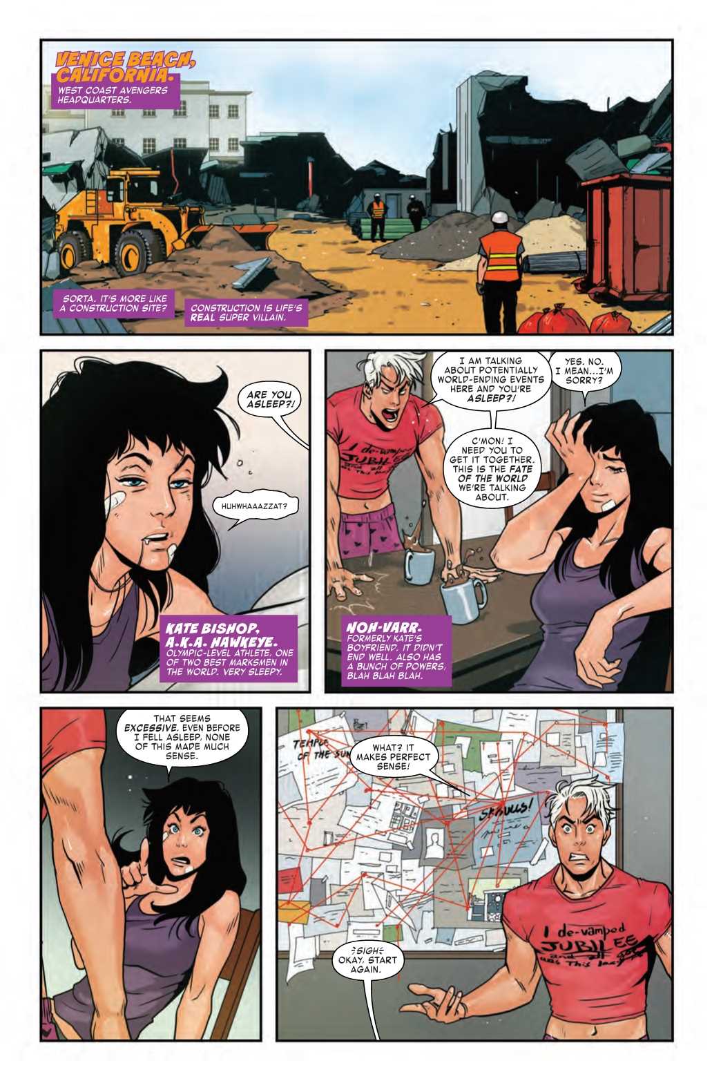 If your alien ex-boyfriend showed up out of nowhere and started telling you about a secret Skrull conspiracy, would you believe him? If you're Kate Bishop in this preview of next week's West Coast Avengers #8, the answer is apparently no. In fact, Kate can barely keep her eyes open…