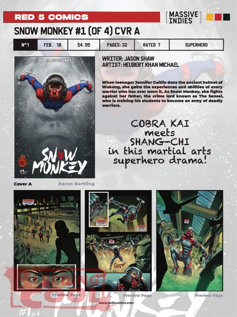 - Snow Monkey #1 debuts in February 2026, mixing martial arts action with mythic legends in Red 5 Comics.