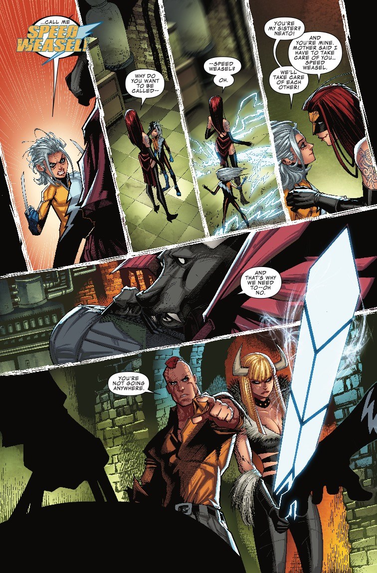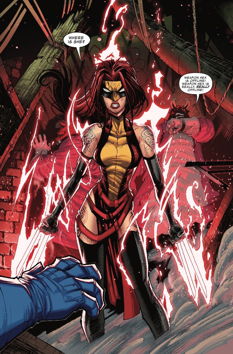 Weapon Hex is an amalgam of X-23 and the Scarlet Witch, who was raised as a clone along with her sister, Speed Weasel, an amalgamation of Honey Badger and Quicksilver, to blend magic and, uh, claws to become the world's best killing machine. It's all a part of the Infinity Warps gimmick spinning out of Infinity Wars, mashing together two characters to create a brand new one and sell a few tie-in one-shots and mini-series. Or then again, maybe this is just the latest retcon for Quicksilver and the Scarlet Witch, whose history and parentage has been the subject of more interference from Marvel editorial than any Infinity Stone could possibly muster.