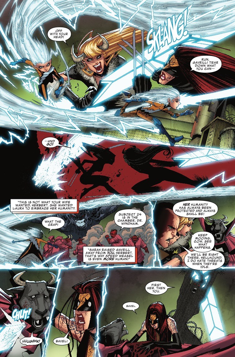 We haven't been following that closely, but we're pretty sure the last Scarlet Witch and Quicksilver retcon revealed that Magneto screwed Bova the cow-person and produced them as offspring, or something like that. It's hard to keep track. Speaking of Bova, her analog here in the Infinity Warps universe is Bavel, and Bavel is about to meet an untimely end at the hands of Hellhound in this preview of next week's Infinity Wars: Weapon Hex #2…