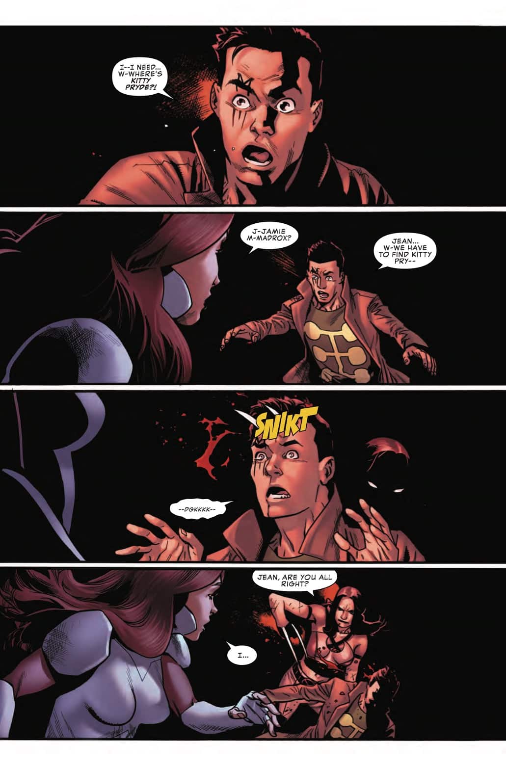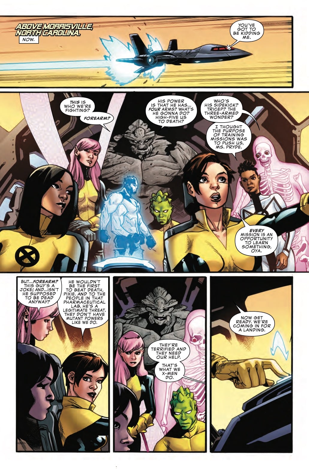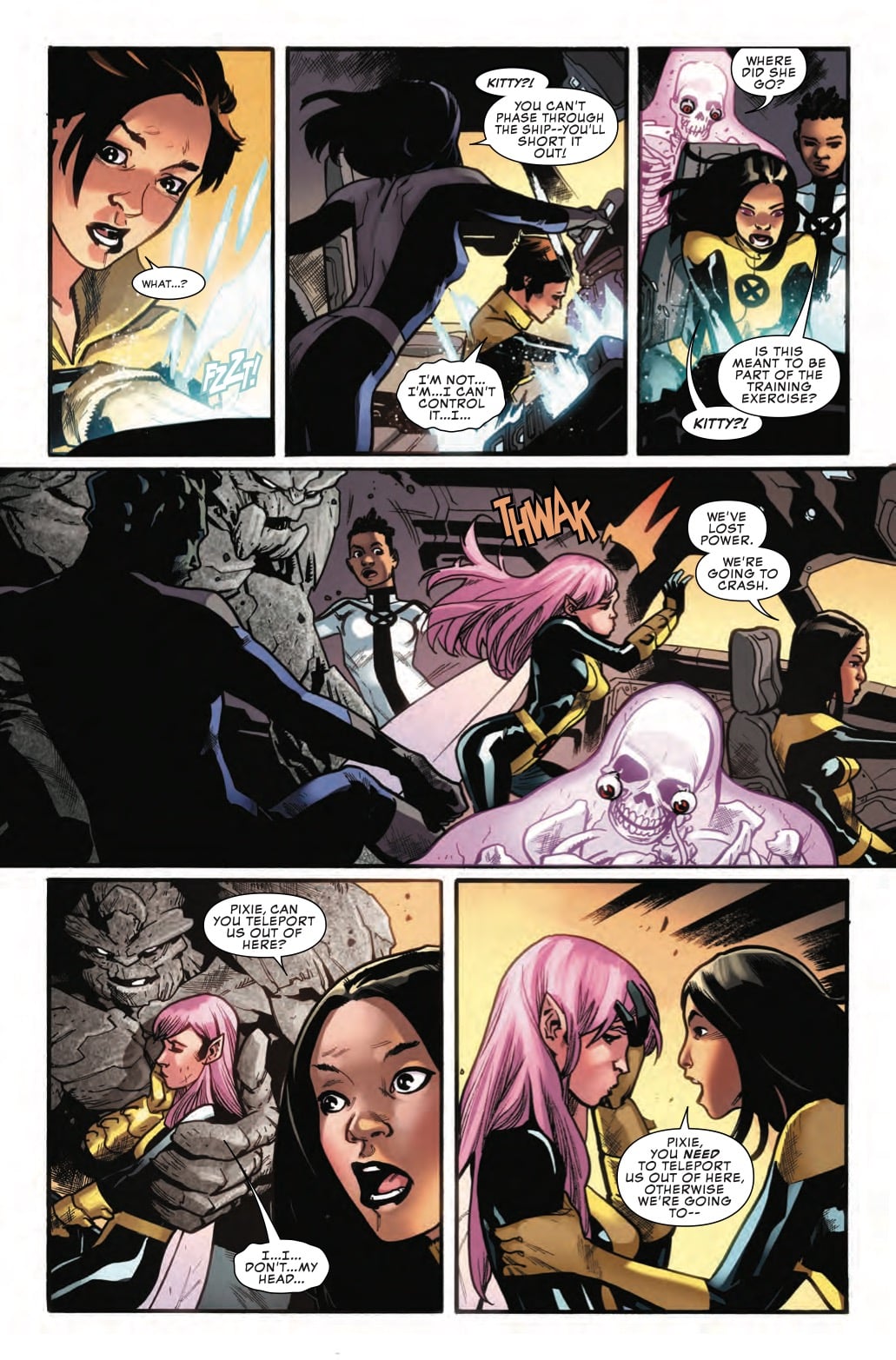 We know from previously seen unlettered previews pages that Kitty was taking a plane ride with some of the X-students, and that the plane crashes, leading to a battle with the Mutant Liberation Front, but that Kitty is nowhere to be found during the battle. Where did she go?