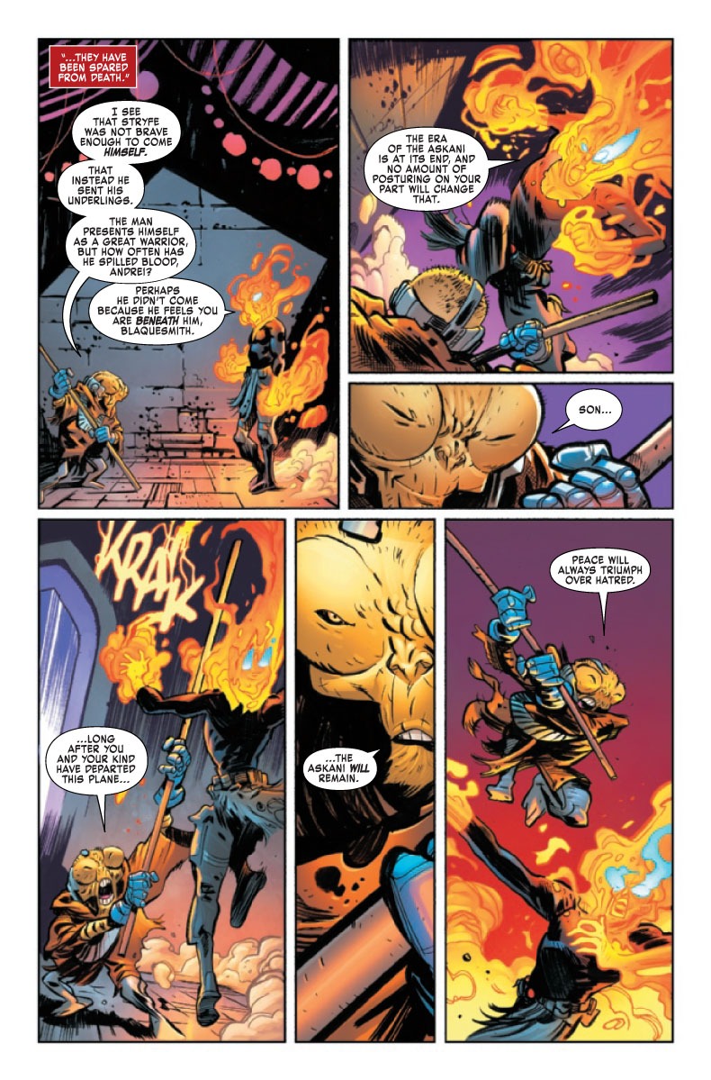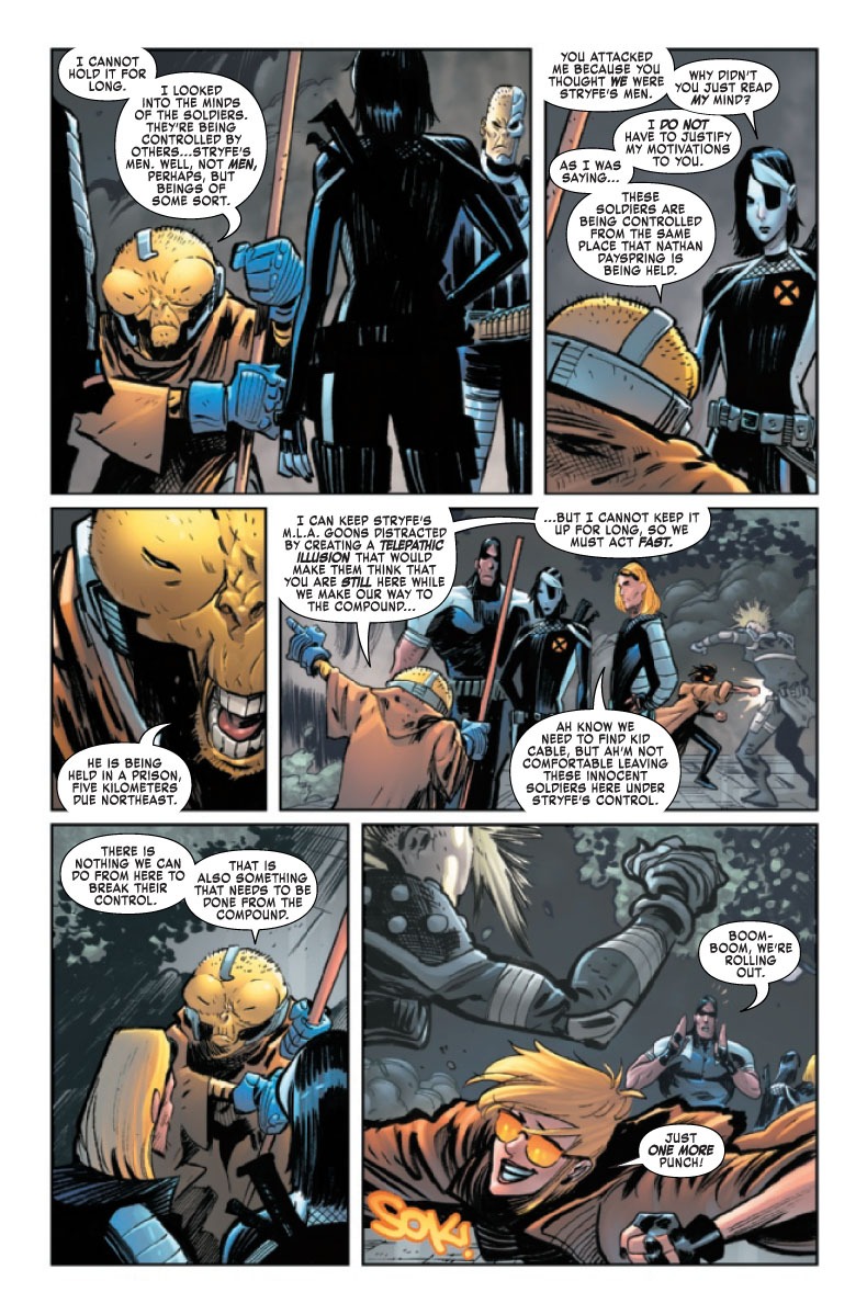 Rachel disappeared after Extermination, taken into custody of the Transian government after they captured Ahab and traded to Stryfe in the future, where Stryfe is using Rachel, still in the form of a mindless hound, to lure the remaining resistance into a trap. This preview of X-Force #9 shows the titular heroes, X-Force, in a battle at that location…