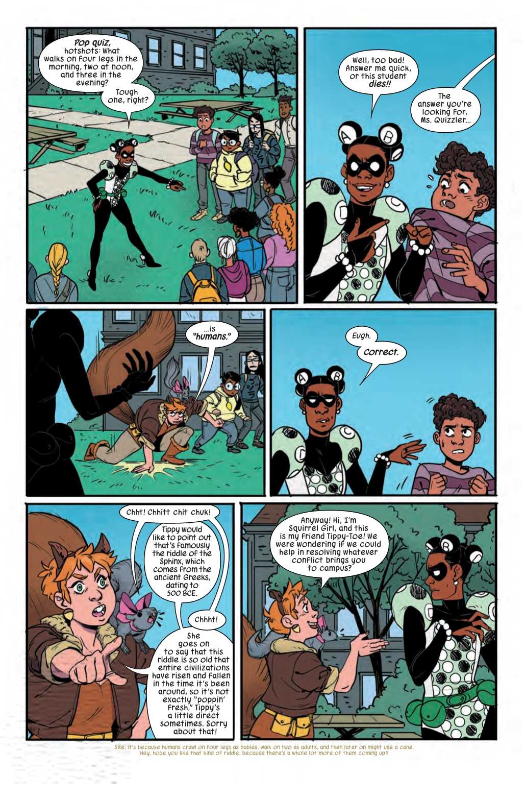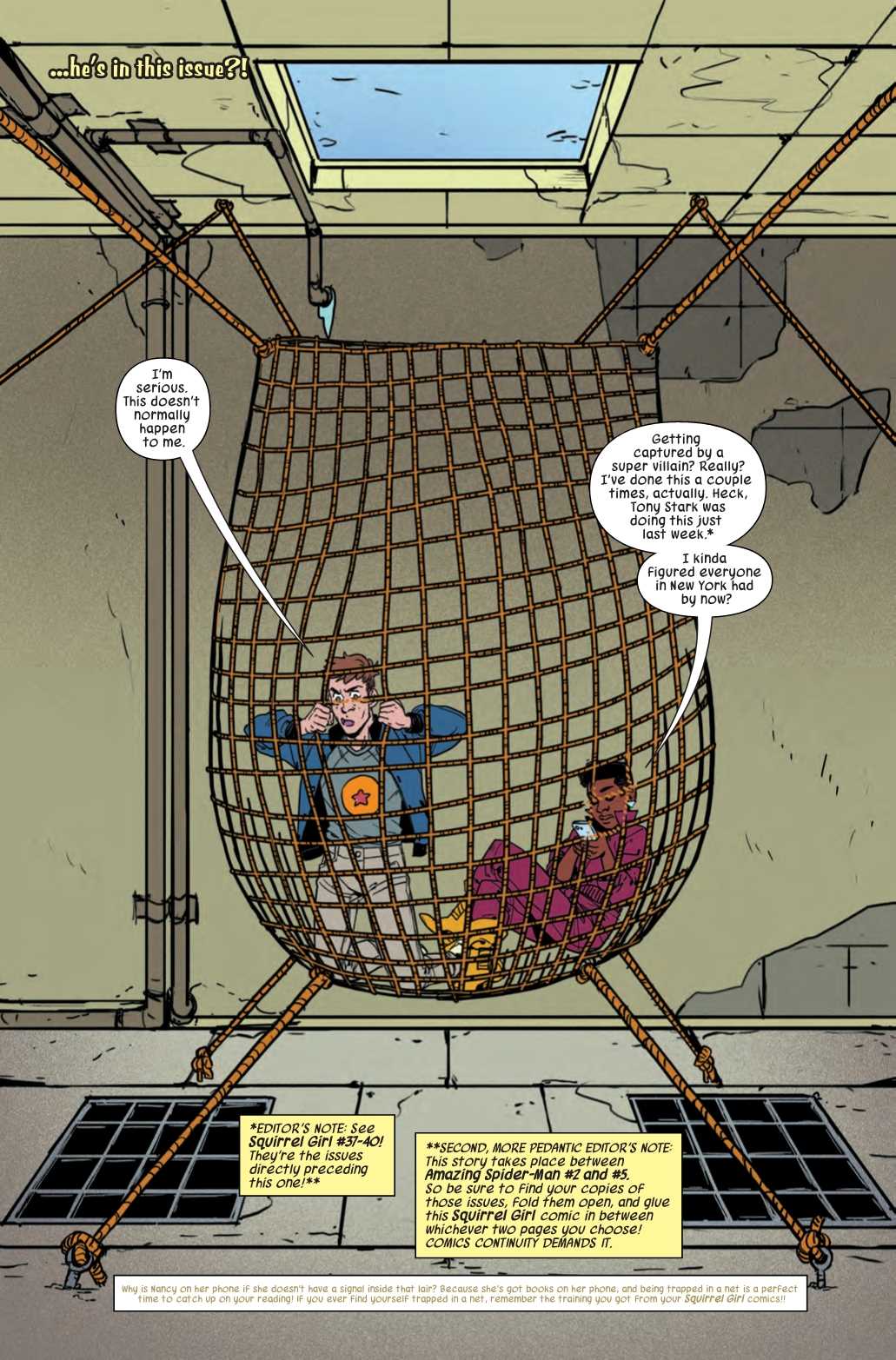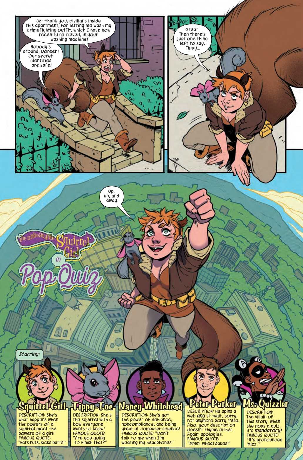 Next week's Unbeatable Squirrel Girl #41 guest-stars Spider-Man, which means Unbeatable Squirrel Girl gets to partake in one of comics most storied traditions: retelling the origin of Spider-Man! It happens as a matter of recap at the beginning of the preview for next week's issue.