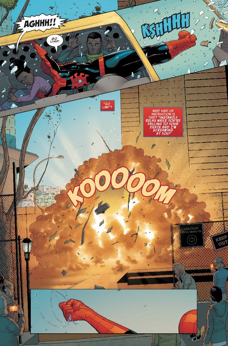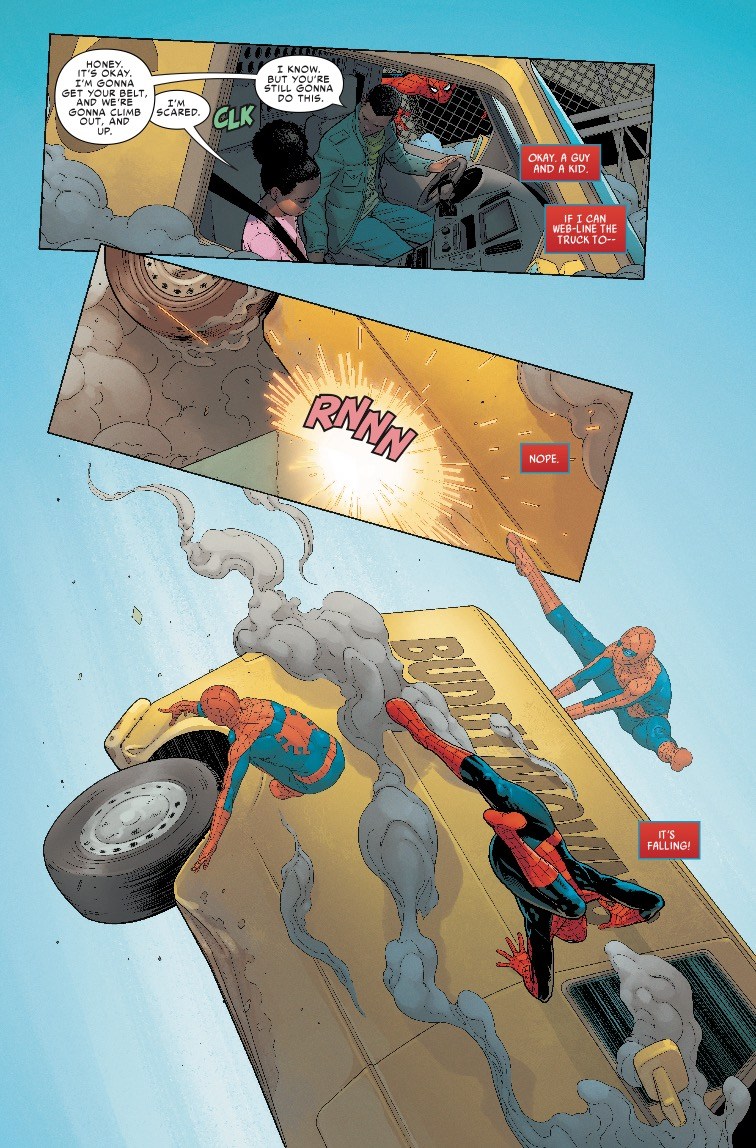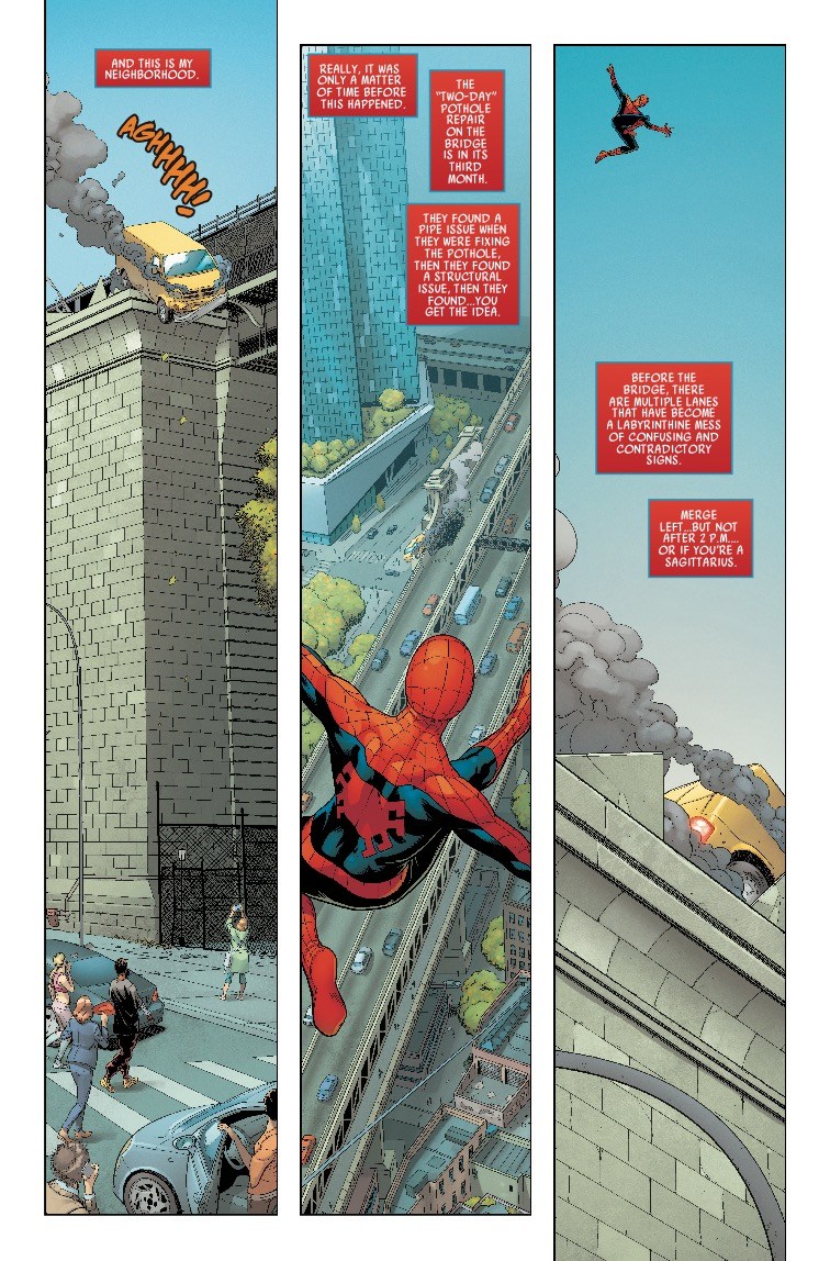 It seems that a two-day pothole repair job has stretched out for months, causing all sorts of traffic problems, and ultimately leading to a van careening off the side of a bridge. Luckily, Spider-Man is there to save the day…