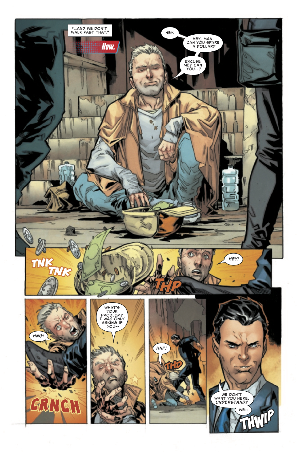 And now, in adulthood, Peter has internalized that message, so when he sees a businessman intimidating a beggar…