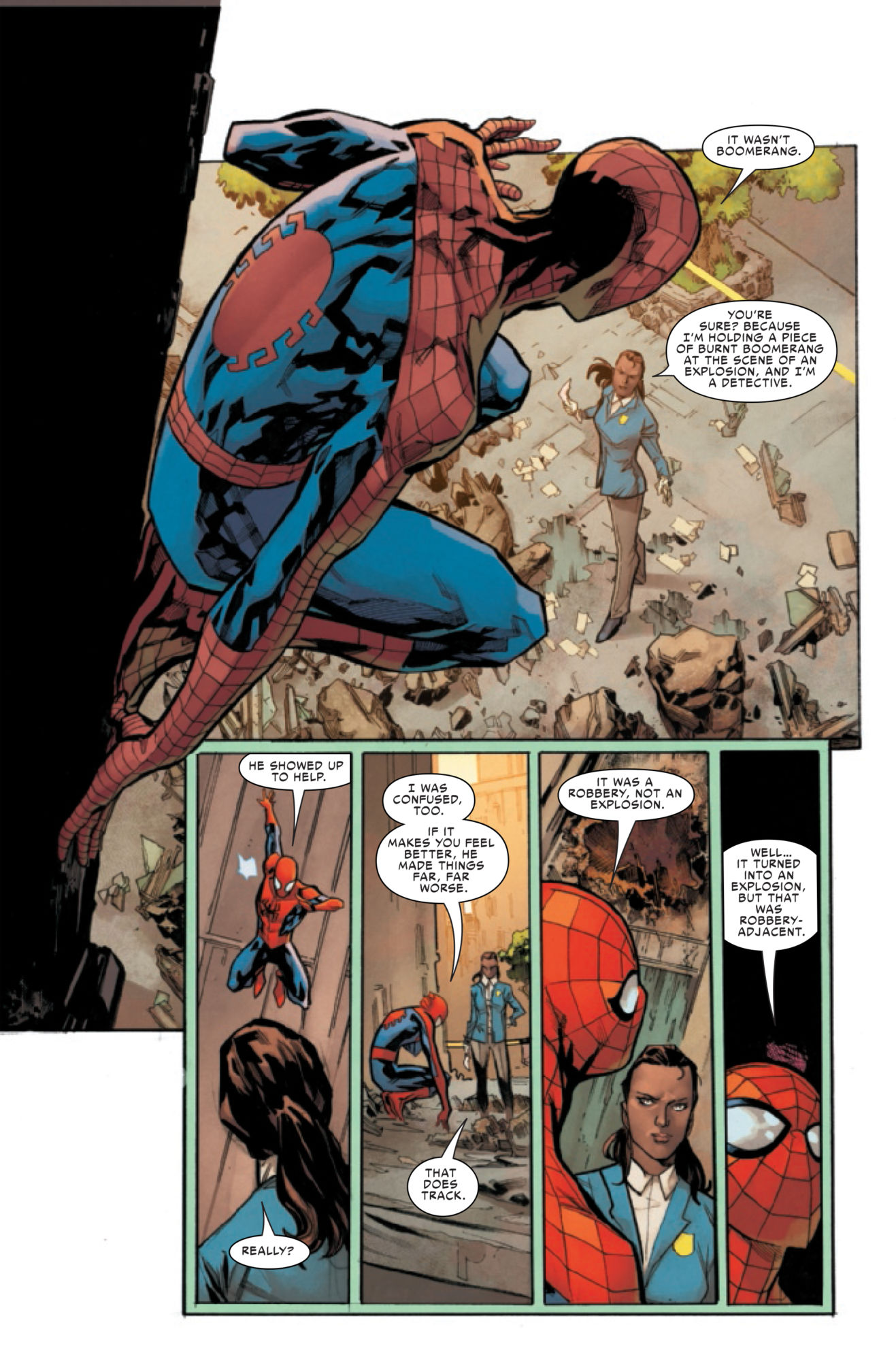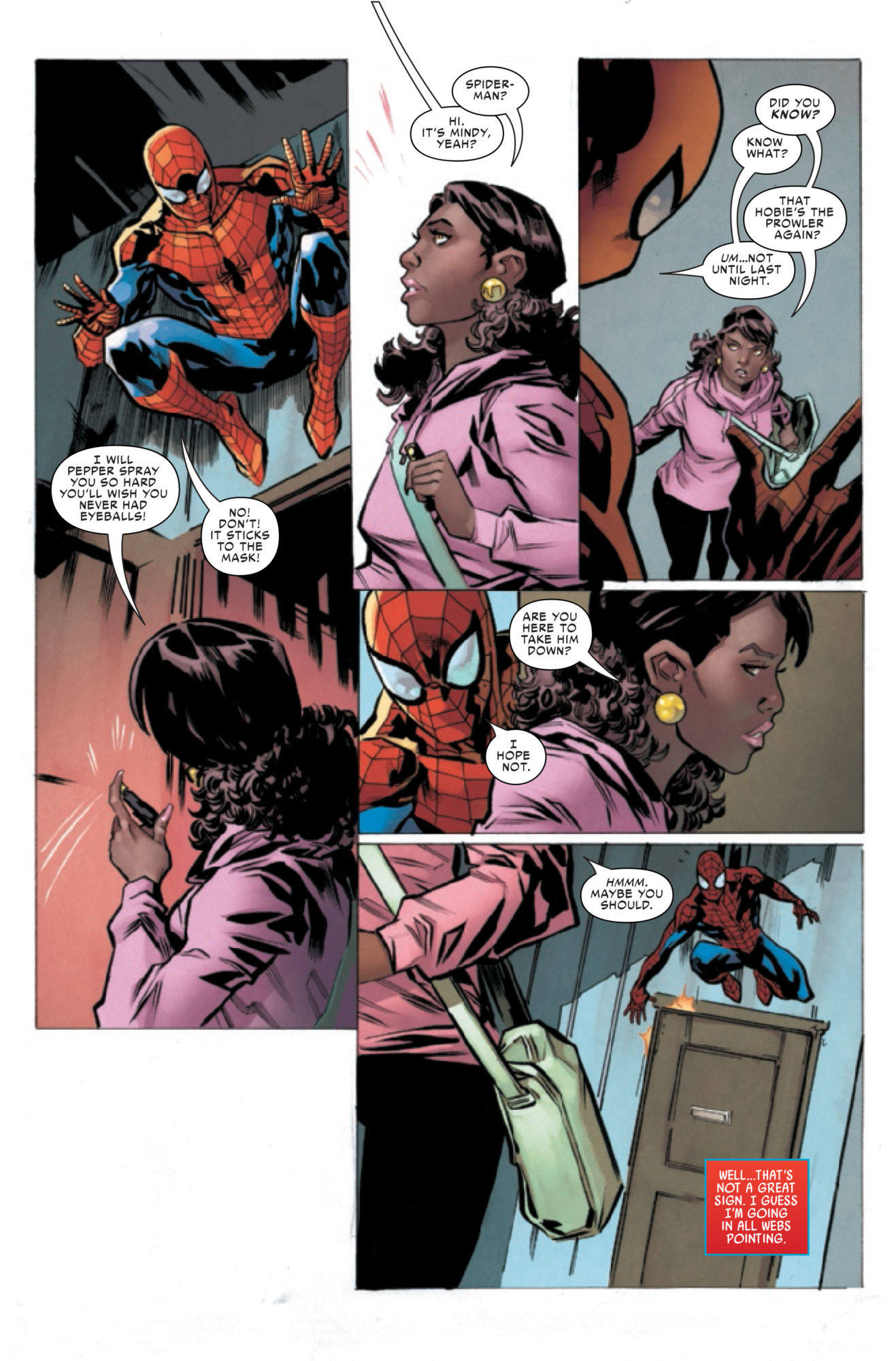 In next week's Friendly Neighborhood Spider-Man #8, will Spidey gain the proportional speed and strength of a stool pigeon? Spidey often finds himself harassed by the police, thanks largely to the negative publicity he's been getting from the Daily Bugle for decades. But Spidey finds himself in the interesting position next week of working directly with the policy as they investigate an explosion at the homeless shelter run by his Aunt May… and partially caused by his roommate.