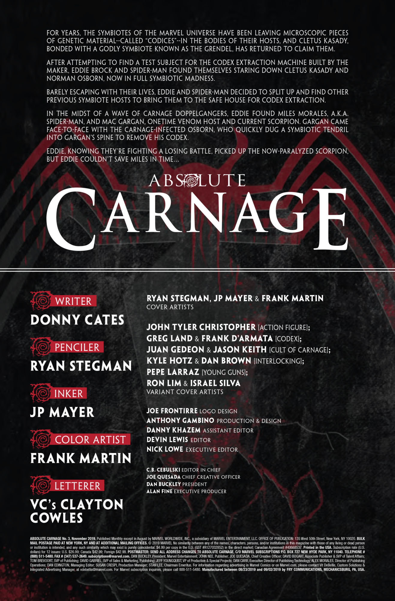 • After the harrowing events at the end of ABSOLUTE CARNAGE #2, Venom and Spider-Man have to deal with the hard truth that not everybody will make it out of this conflict in one piece… if they make it out at all, that is.