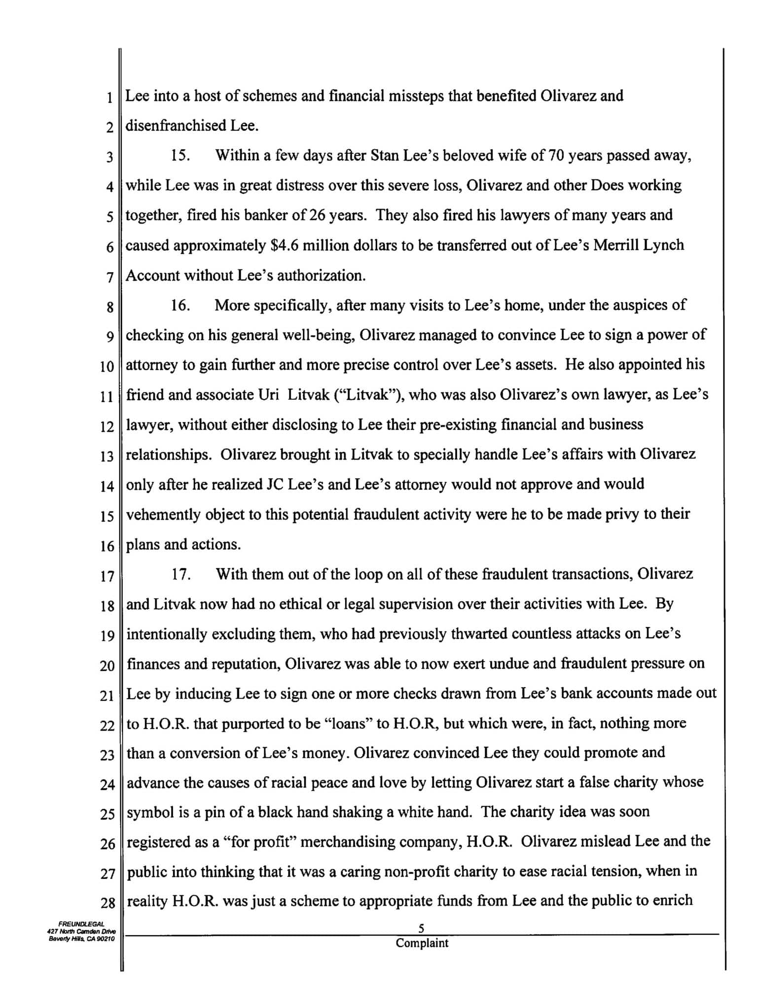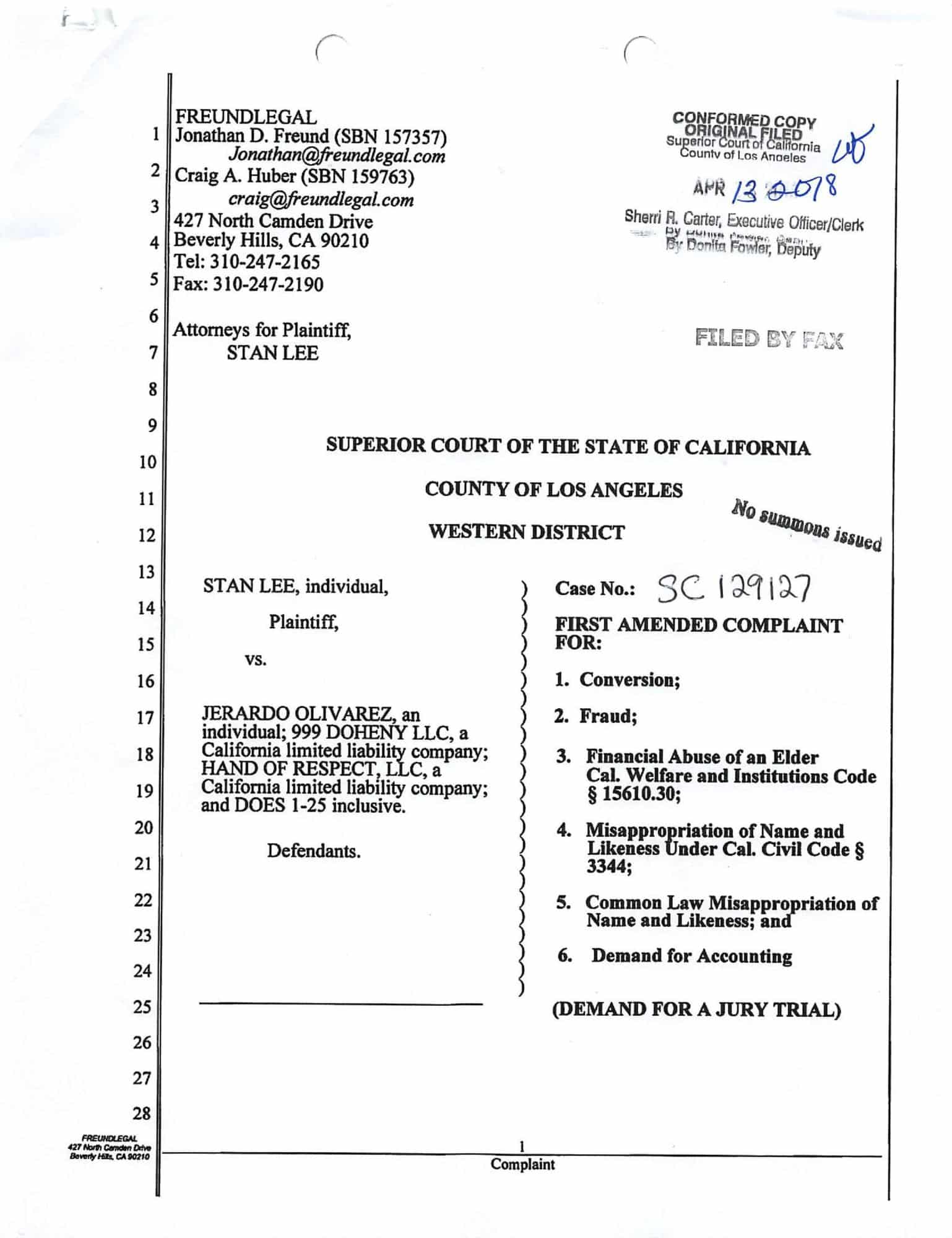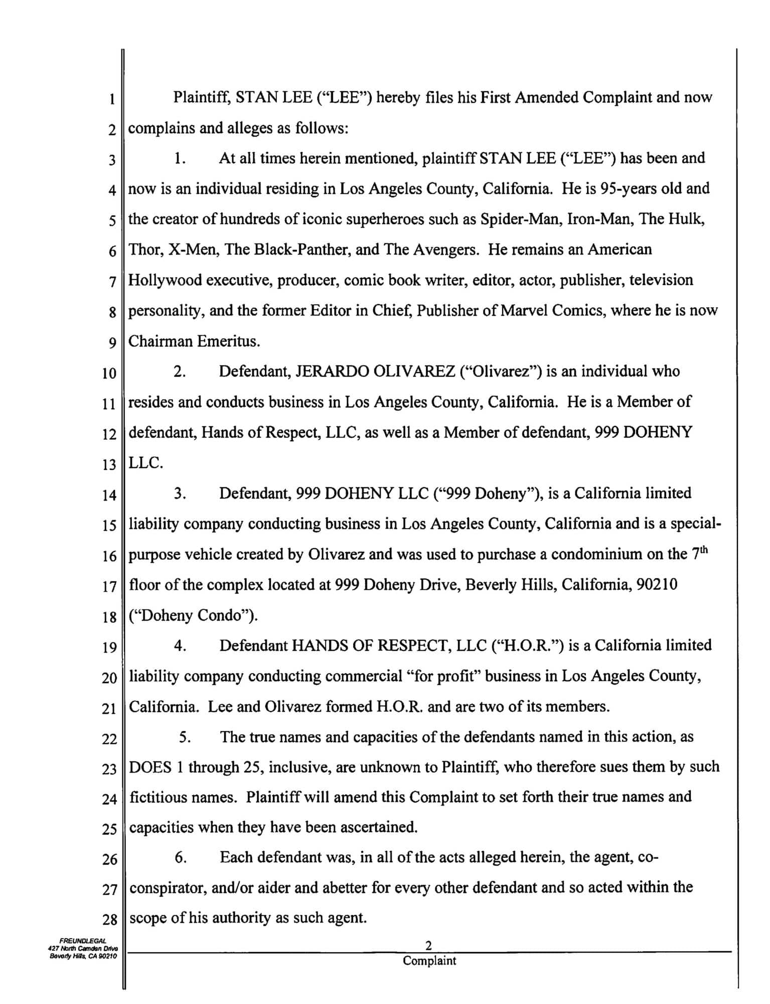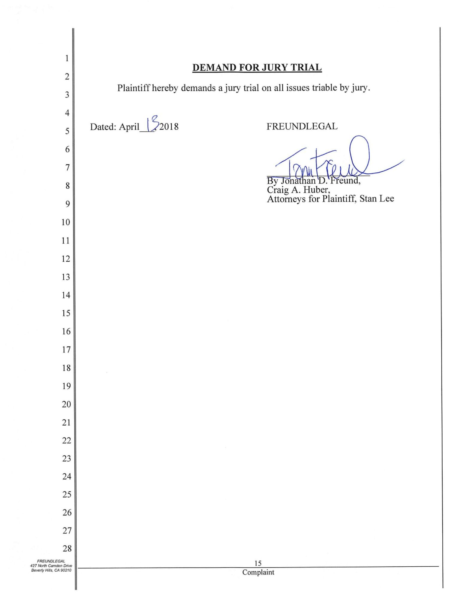 The suit, filed by Stan Lee's most recent legal counsel at Freundlegal (though it misspells Hands of Respect up top) does mention 25 John Does, suggesting that others may be named during the pursuit of the case.