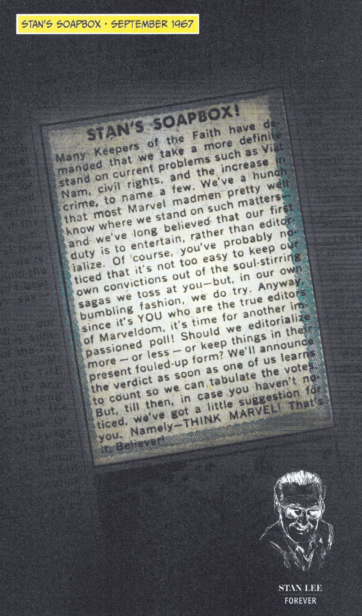 Anyway, here's tomorrow's. And, topical as ever, it sees Stan Lee asking his readers if Marvel comics creators should include even more politics in their titles? That they had been asked by some readers to tackle subjects such as civil rights, the Vietnam war, and Stan confesses that it's hard to keep their convictions out of their storytelling… but asks the readership as a whole what they thought?