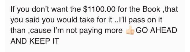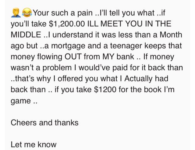 The buyer returned a month later, wasn't happy that the deal was no longer available, and sent the following messages.