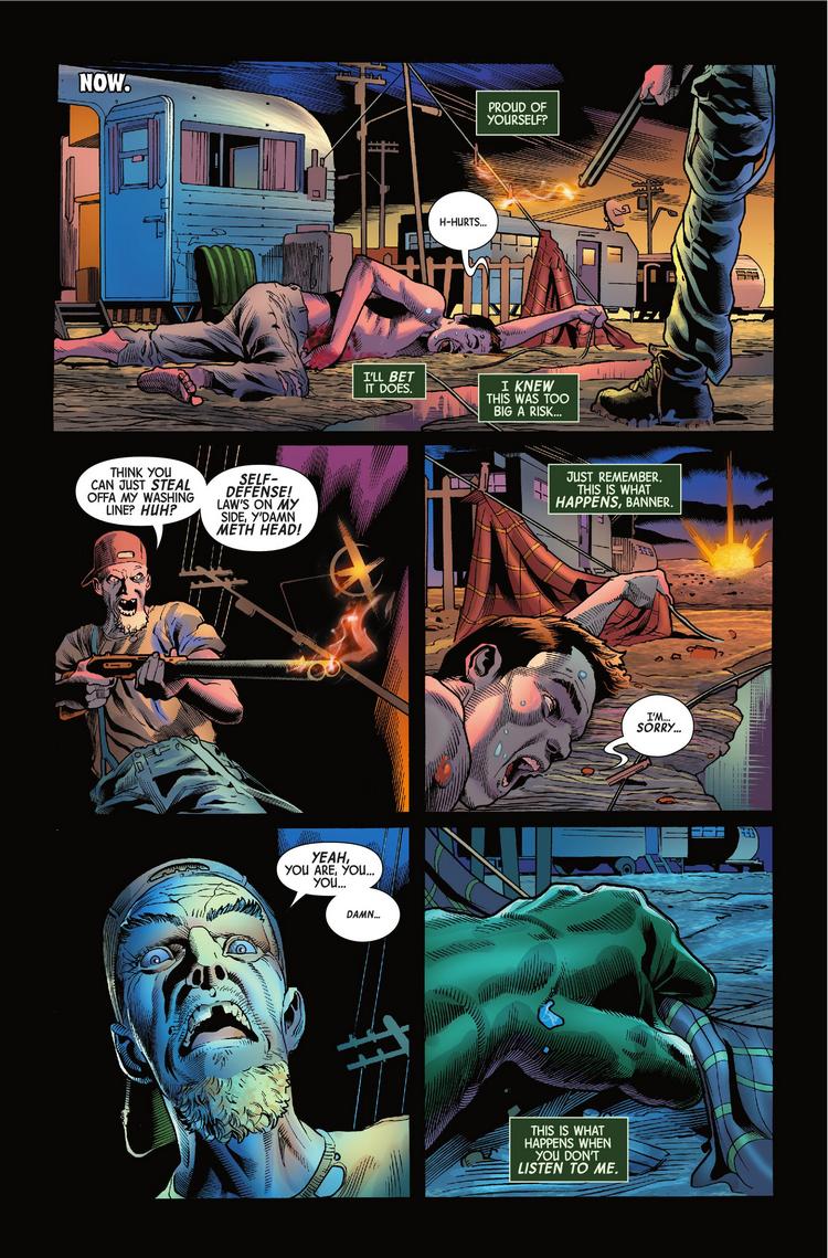 Gosh, more politics in our Marvel previews! We're going to need a fainting couch if this continues much longer. Remember back in the good old days of the 1980s when there were no politics in the comic book previews we read each week on the internet? In next week's issue of Immortal Hulk, Bruce Banner is in trouble, having found himself at the wrong end of a shotgun in a trailer park in what we assume to be Florida. And being as he's trespassing, according to the homeowner, the law is not on Banner's side here…