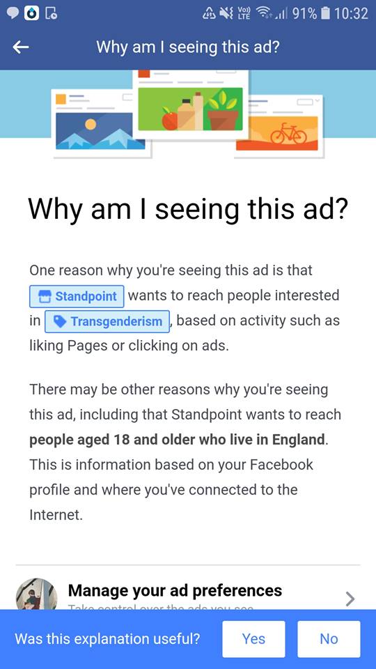 But it seems to be a very different thing for Facebook to take money and to specifically push that ad at the transgender community. Which is likely to be a significant percentage of those who Facebook have decided are interested in 'transgenderism', as they choose to describe it.