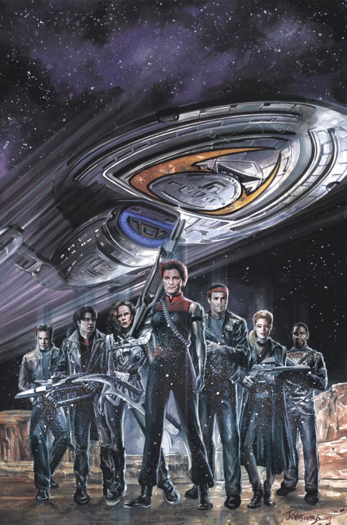"The Mirror Universe looks at characters – and Star Trek as a whole – in a way that's unique and exciting. There really is no greater reward creatively," says Woodward. "I was very excited when IDW approached me about working on a Mirror Voyager story. I'd given considerable thought to what a Voyager crew would be like in the Mirror Universe, and based the look of the characters on designs I'd already completed. With suggestions from IDW and CBS, we developed new ideas and alterations to create a look that I think exceeds anything we've done previously."