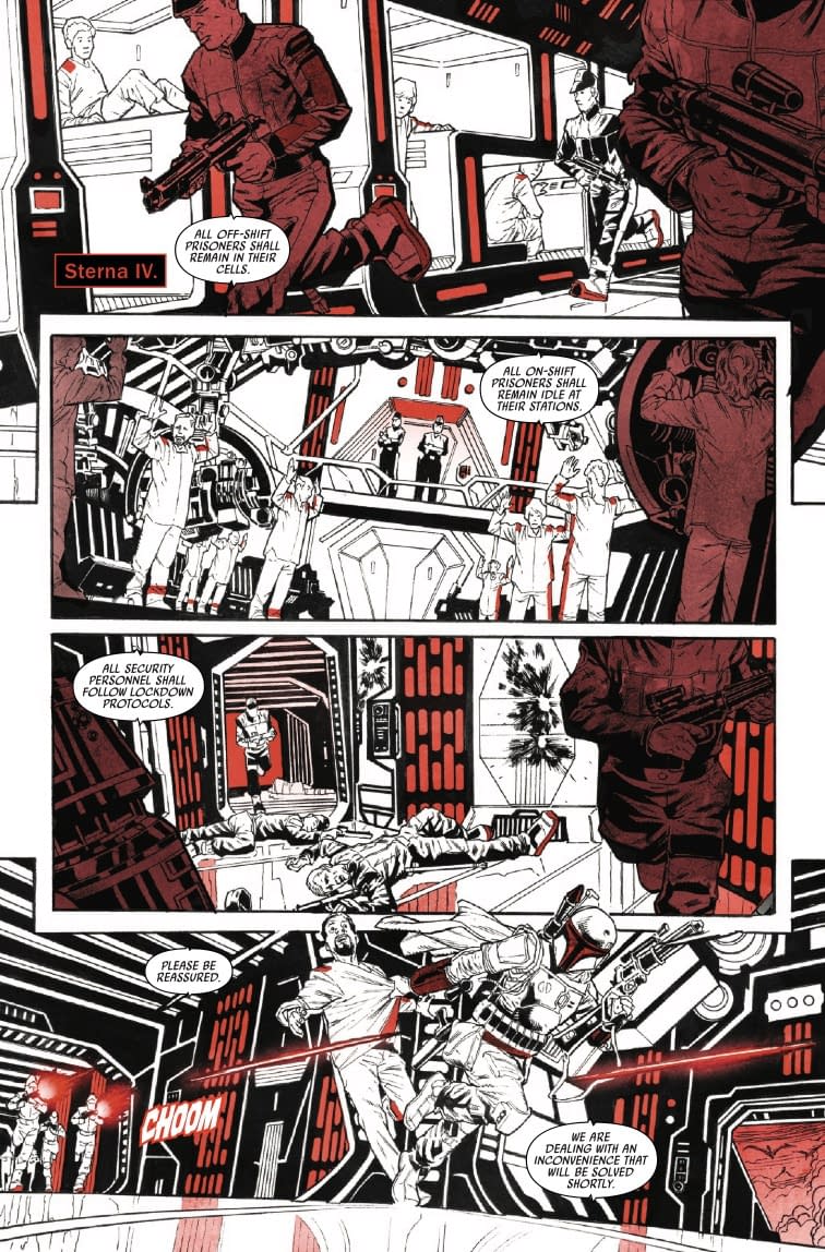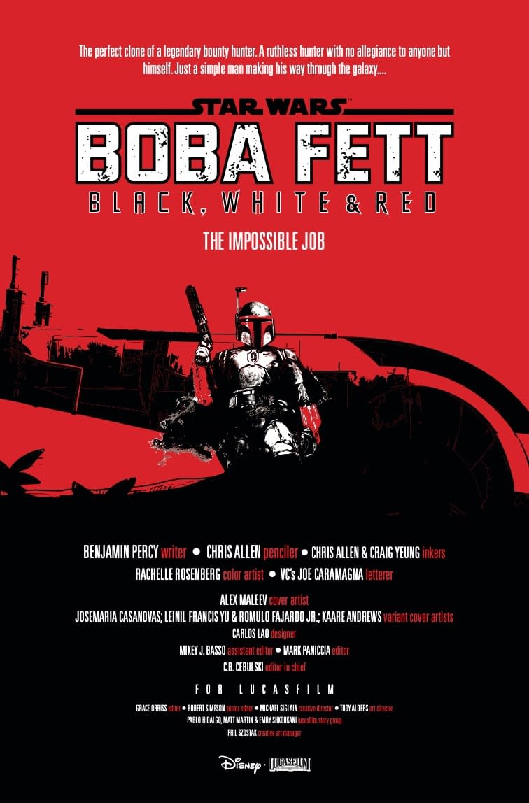 - Boba Fett faces impossible odds between Empire and rebel factions in Star Wars: Boba Fett - Black White and Red #1.