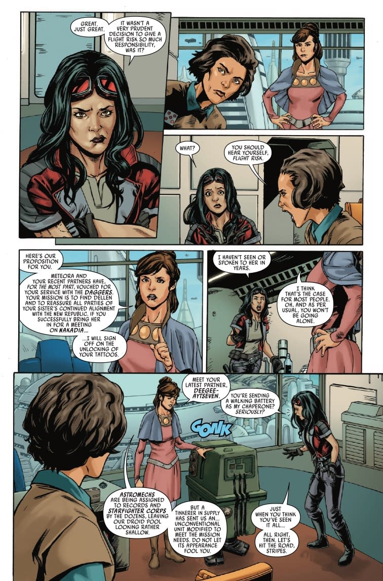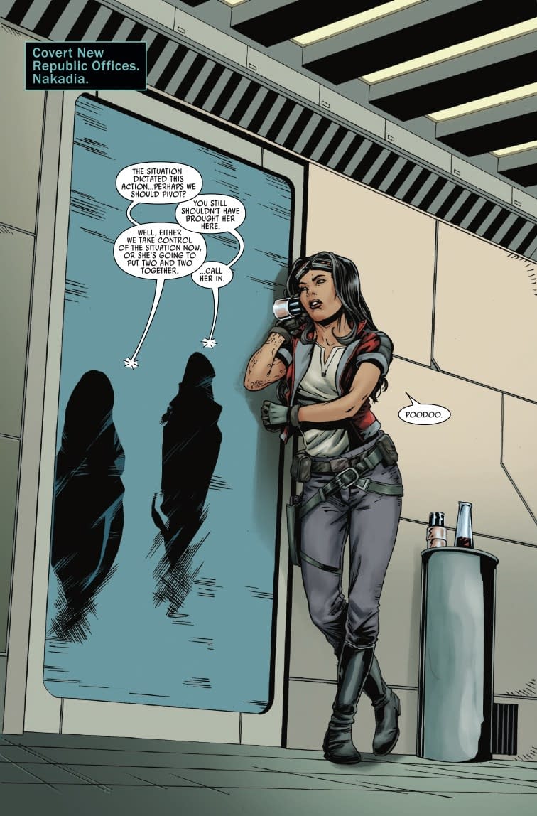 WHO SLICED THE SLICER? To avoid prison, DOCTOR APHRA became an agent of the NEW REPUBLIC! But to keep her in line during her parole, they had her electro-tattoos locked. But who could do that to the galaxy's greatest slicer? The answer WILL SHOCK YOU!
