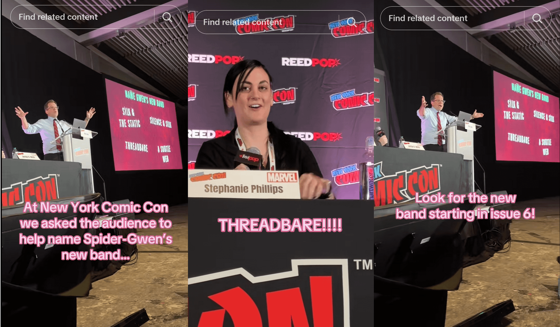 - Spider-Gwen's 616 band name revealed as Threadbare, chosen by fans at NYCC's Spider-Man and Venom panel.