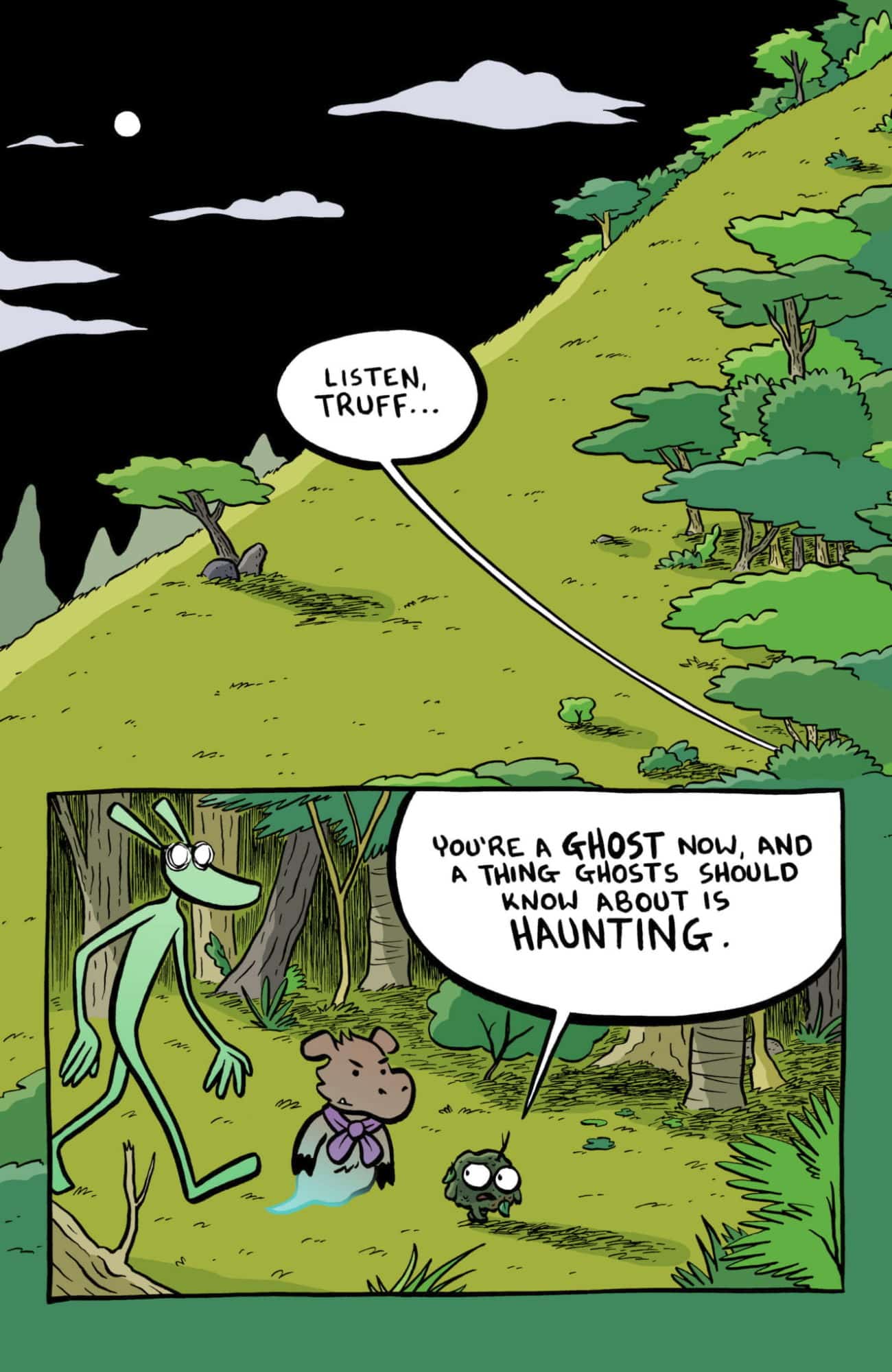 A new graphic novel from the Eisner Award-nominated creator of MERMIN that deftly navigates loss, vengeance, and acceptance! Truff is the ghost of a young boar, fueled by fury towards the hunter who shot her down. She has a lot to learn about her new afterlife, and thankfully the forest spirits Claude and Stanley are there to guide her! However, they soon find that her parents, along with their fellow animal villagers, have been kidnapped by the malicious mountain demon Mava! Truff wants to help, but… the hunter is finally within her grasp, and if she lets him go, she may never get her revenge!