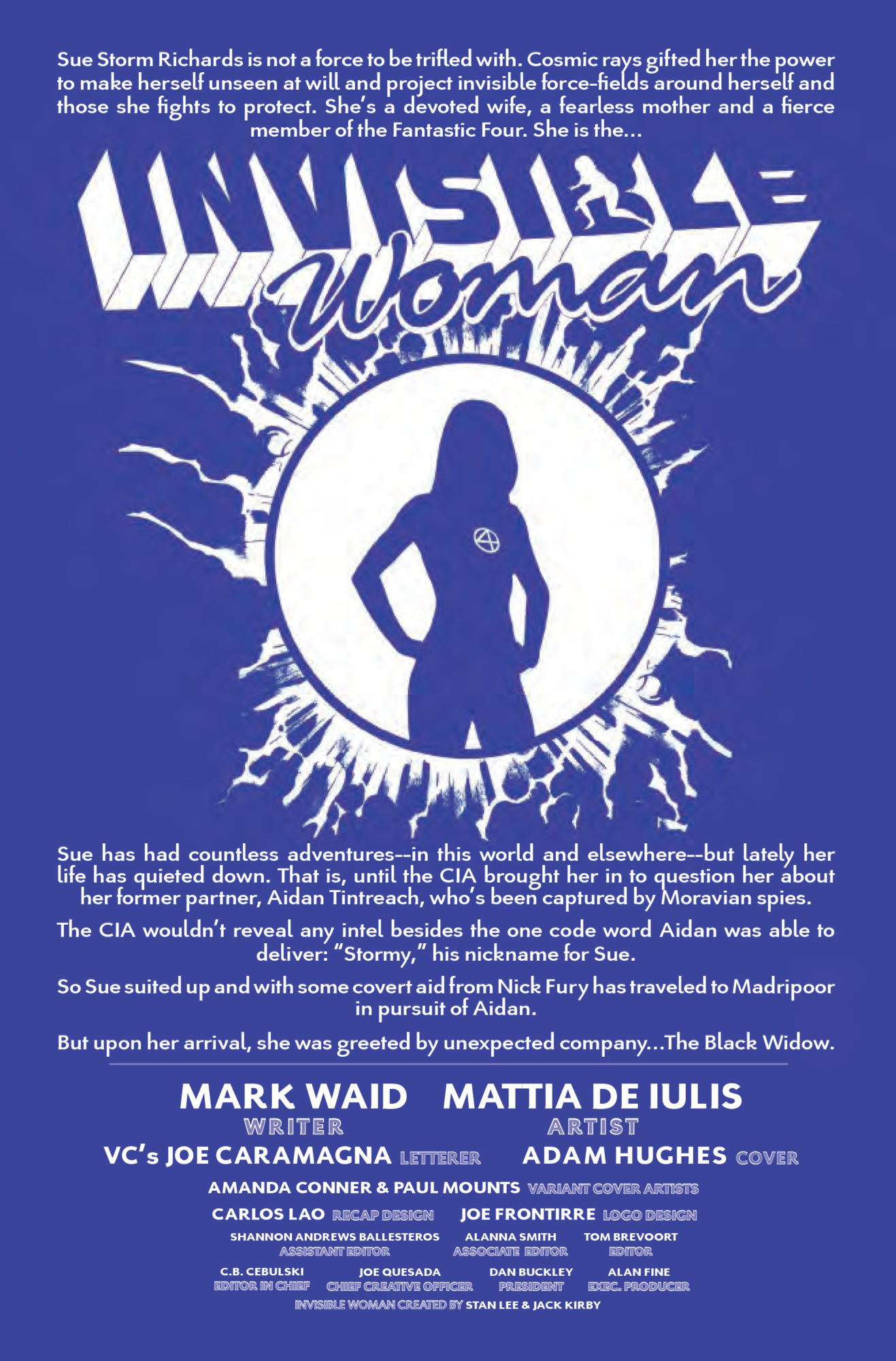 Susan Richards, the Invisible Woman, forms an unlikely – and uneasy – alliance with fellow spy the Black Widow to comb the alleys and palaces of Madripoor! They're searching for Sue Richards' first partner – but what they discover will shake Sue to the core and turn her mission upside down!