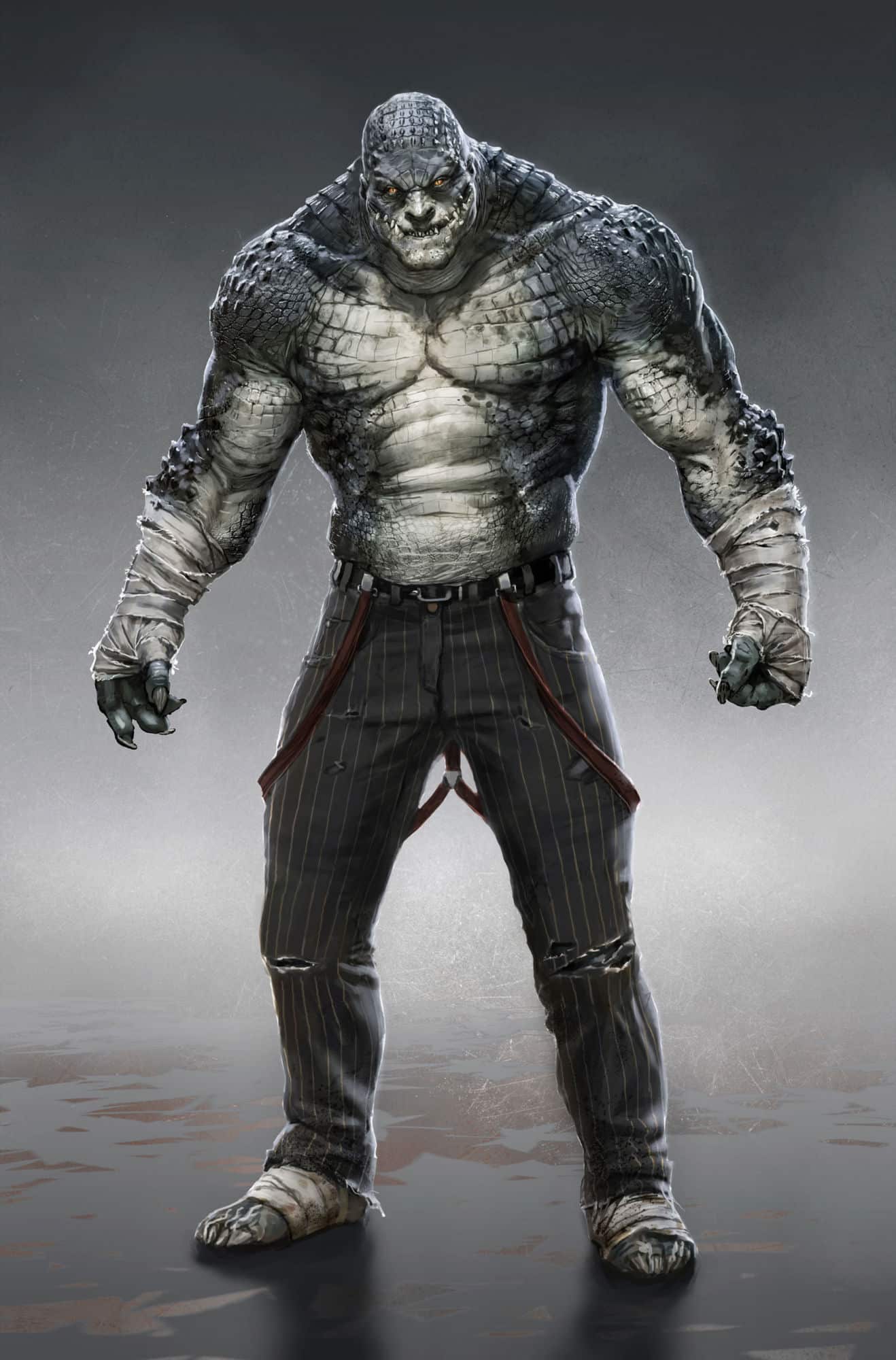 …possibly takes some inspiration from this Killer Croc concept art for Arkham Origins.