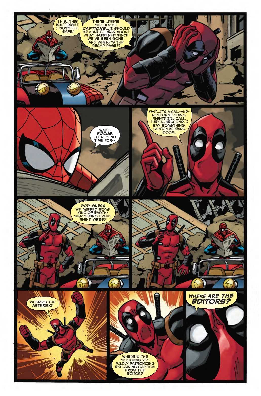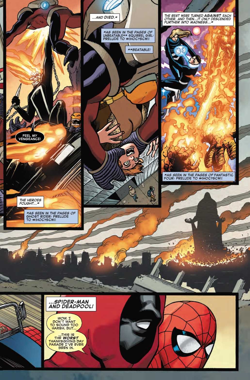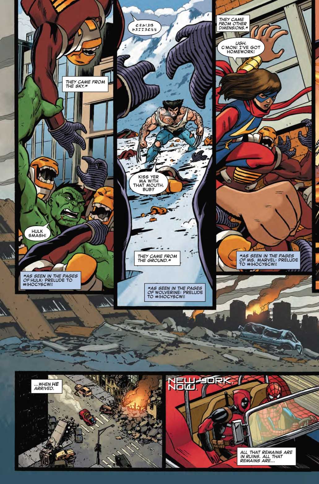 Next week's Spider-Man/Deadpool #46 kicks off the Infinite House of Civil Yet Secret Crisis War Invasions, a storyline set to lampoon Marvel's real-life obsession with pumping out super-mega-crossover event after super-mega-crossover event in a desperate attempt to spike sales and squeeze more money out of an ever-dwindling readership without doing anything to actually grow that readership. This preview of next week's issue starts things off by pointing out all of the prelude tie-ins you should have read before picking up this comic.