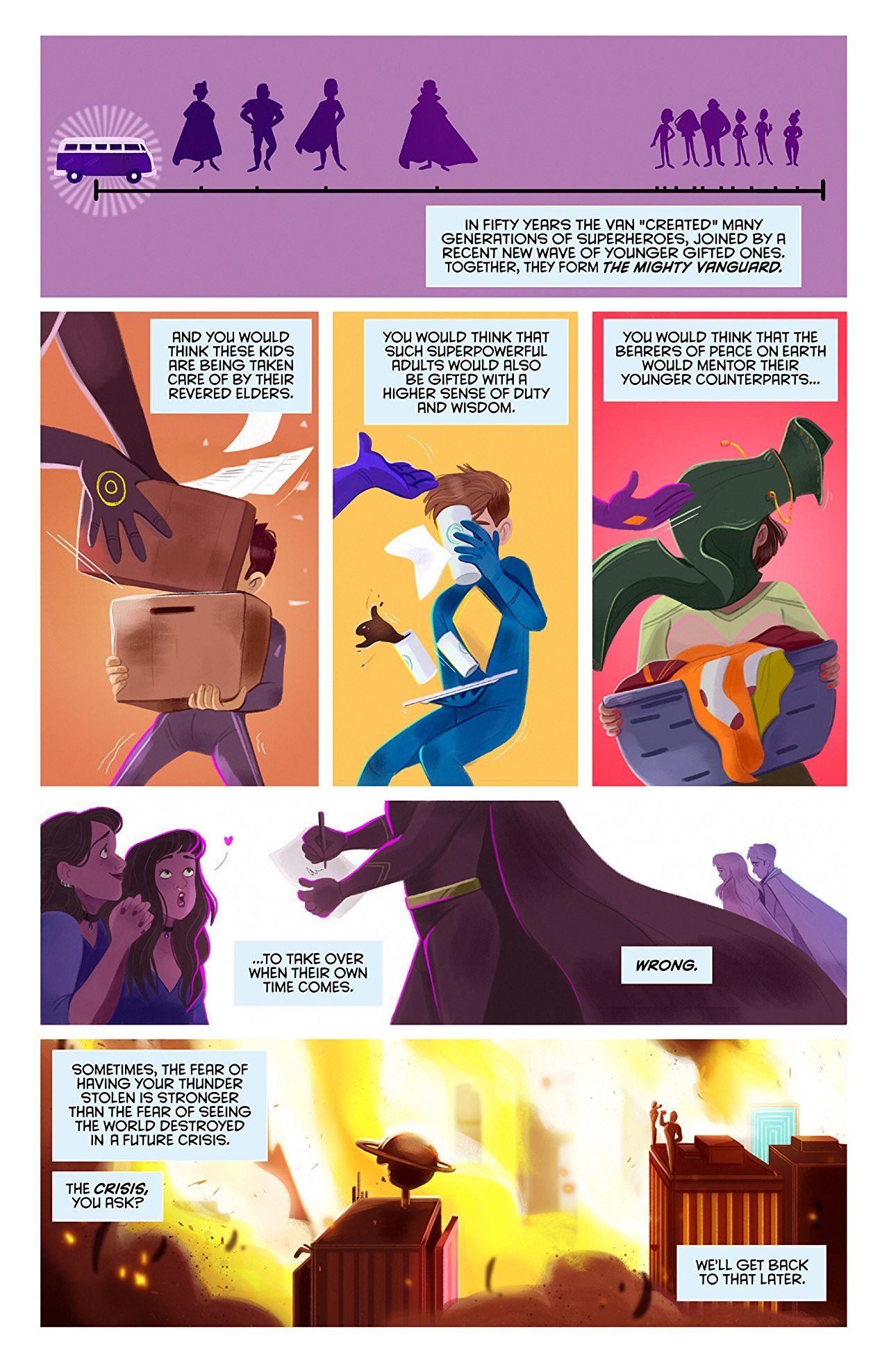 The enormous fight our heroes still rages on over the city! As a last resort, the sidekicks turn to the Mayor for help, but will she stand with them? Find out in the epic conclusion of this superhero comic that will leave you wanting to hug your friends!
