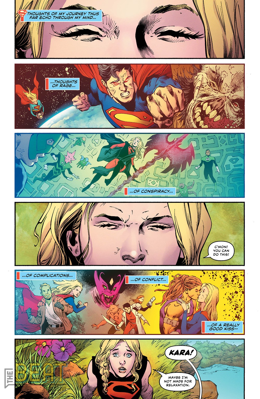 After the grueling battles of the last few issues, and, well, come to think of it, since Supergirl began her journey to find out the truth about what happened to Krypton, the Girl of Steel could really use a break. Unfortunately, she seems to be having trouble concentrating on relaxation, in part due to a certain recently developed love triangle, as we see in this preview of tomorrow's Supergirl #29…