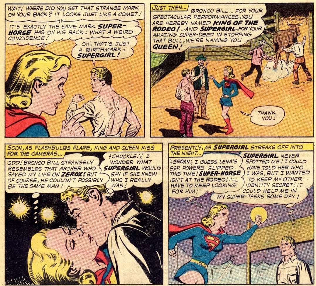 Because, yes, that was an actual thing. Back in Action Comics #301 and #311, Supergirl got quite involved with one "Bronco Bill", who it turns out was her own horse Comet, without her knowledge, a centaur who had been transformed into a super horse by Circe…