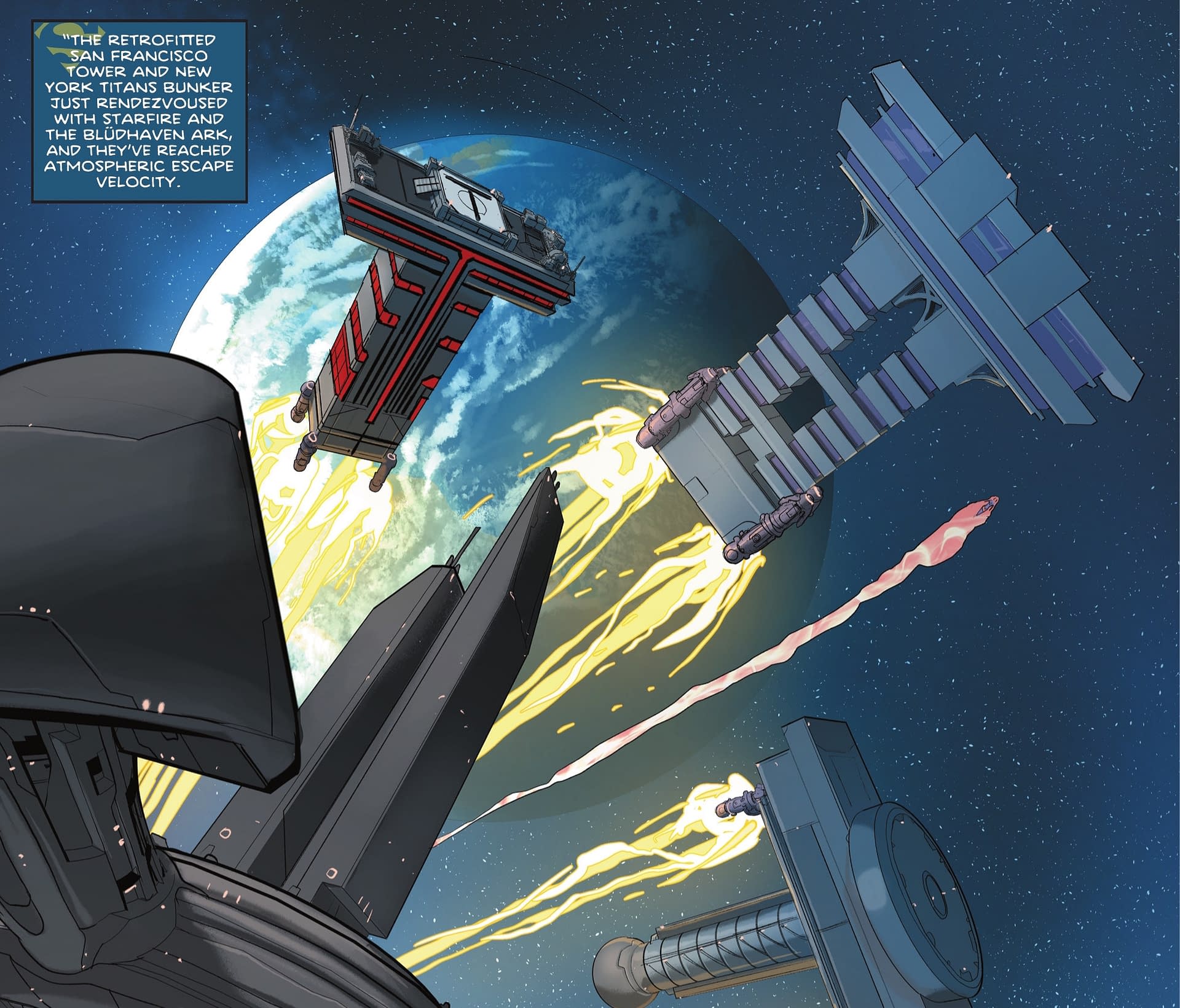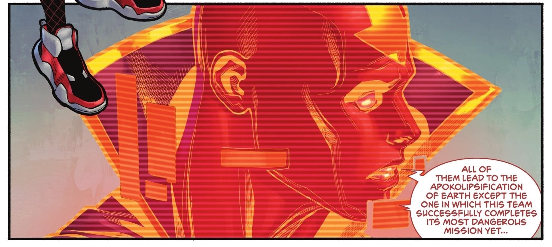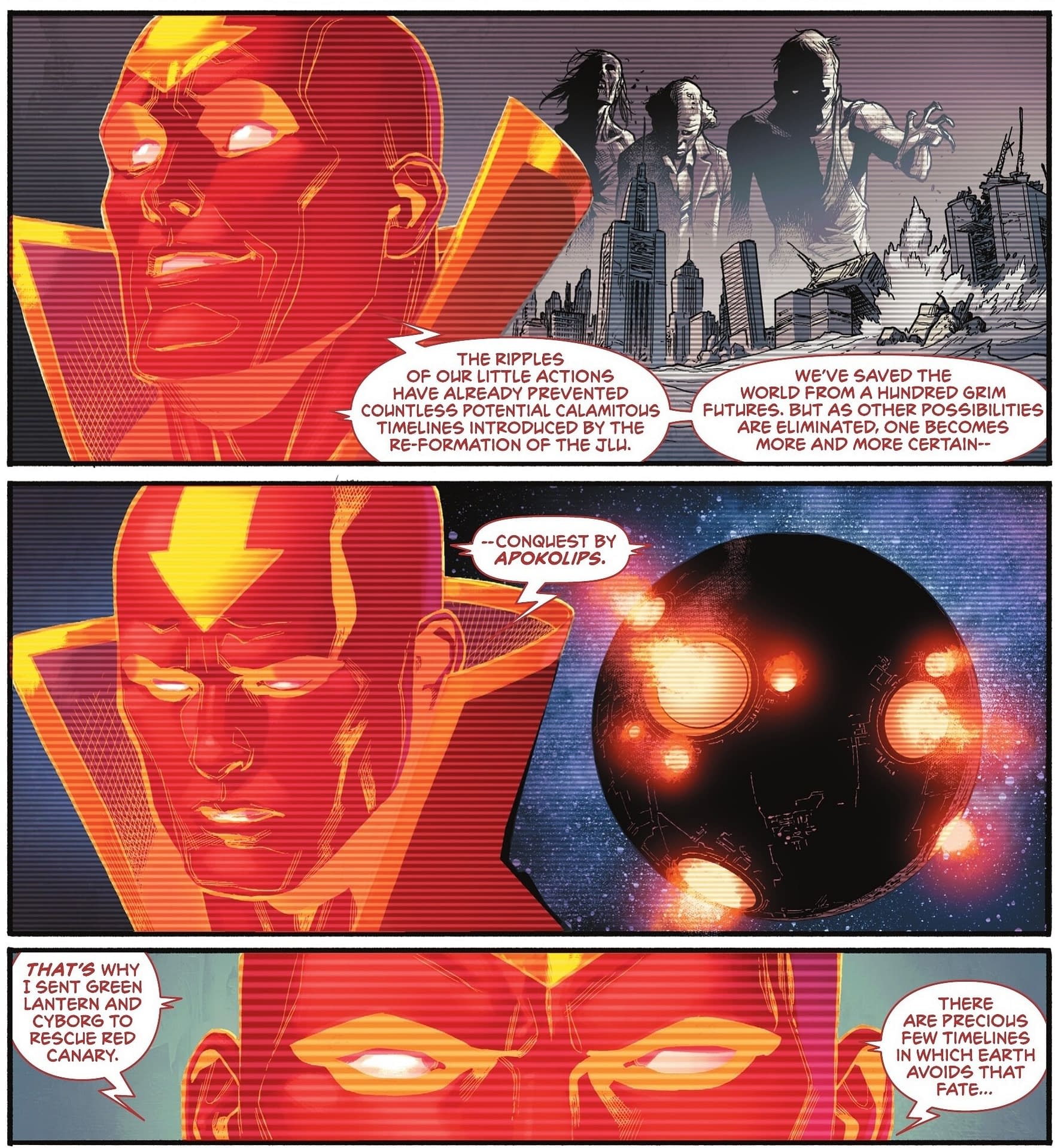 Bleeding Cool mentioned that this might be coming… previously, I wrote, "DC's K.O. is coming. The big knockdown fight event, to take on Darkseid. But before any of this can happen, something is going to have to happen to the Earth. Everyone is going to have to be evacuated. The entire planet. The fight is coming, it is coming to Earth, and there can be no harm done to the bystanders. Darkseid plans to build a new Apokolips on Earth." Indeed, today's Justice League Red #3 by Saladin Ahmed and Clayton Henry sees Red Tornado prophesying such a future, and underlining the need to save Red Arrow, to stop it.
