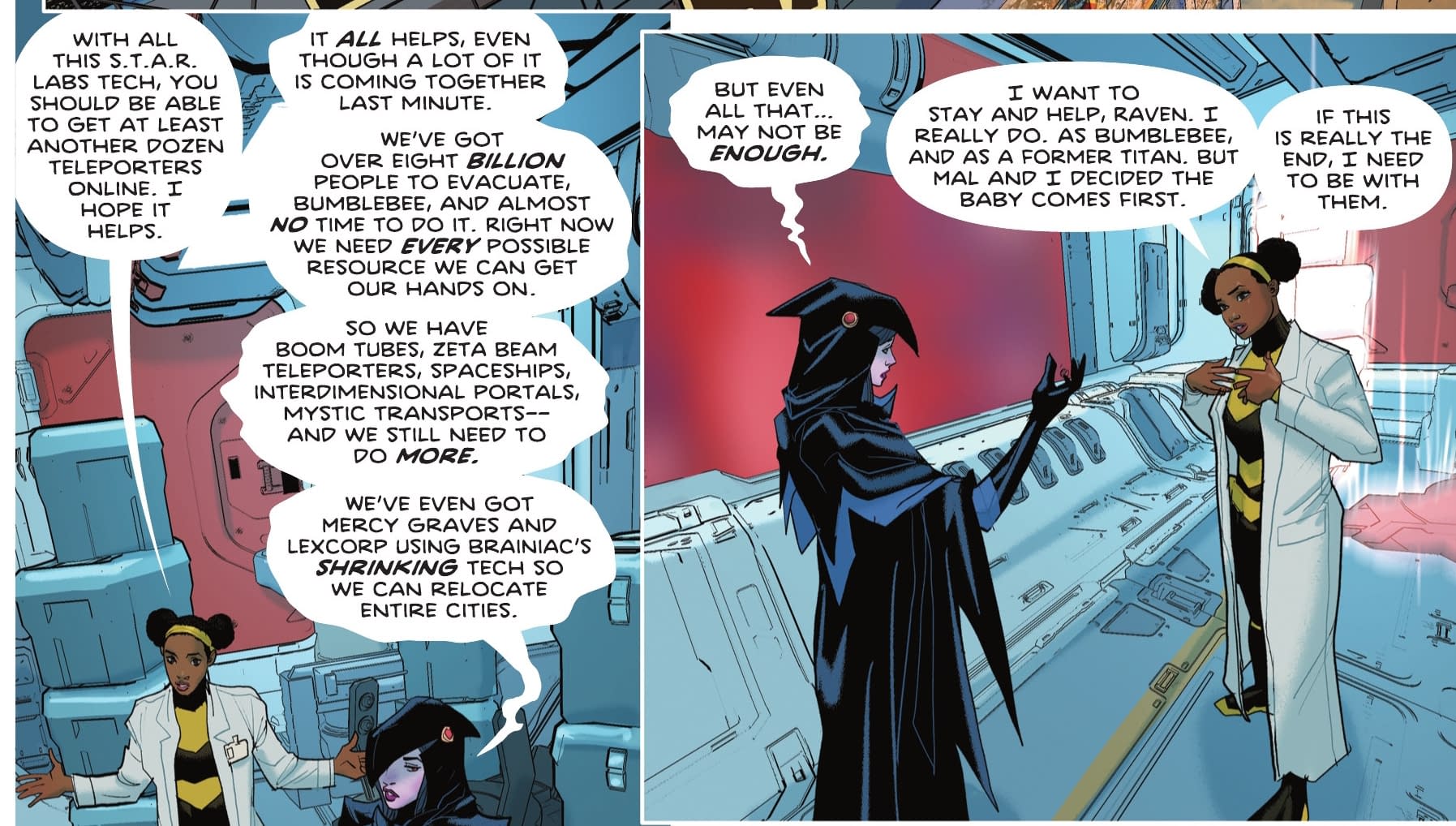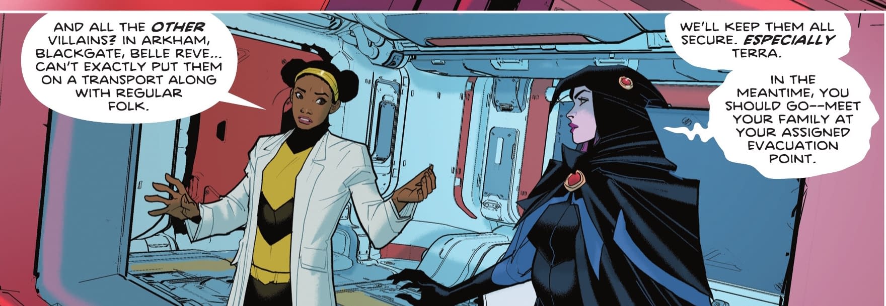 I mean, right? But while all that is going on, the Titans are dealing with the here and now. The DC K.O. battle is to find a champion imbued with Omega Energy to inherit the power of the Omega King rather than Darkseid. As I previously wrote, "it's down to the Titans, minus those in the competition, to evacuate a planet of eight billion people. Ships, teleportation, city shrinking, whatever comes to hand. Oh, and they only have a week." And in today's Titans #28 by John Layman and Pete Woods are both published by DC Comics today, it comes to pass.