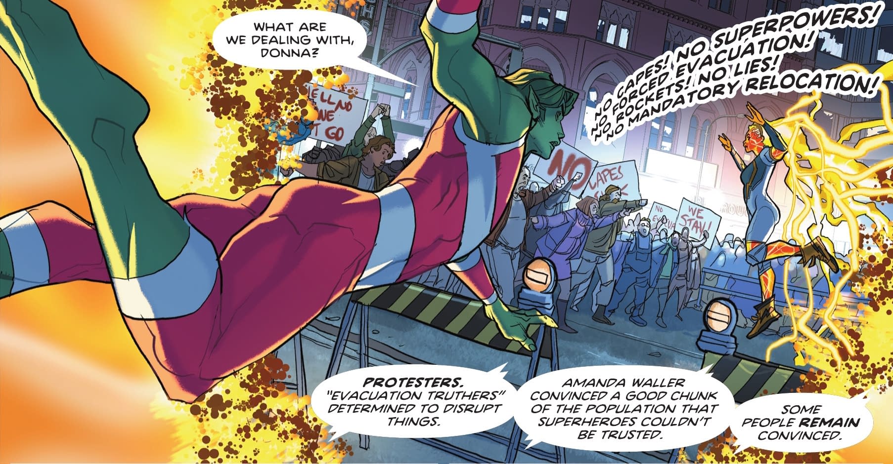 …"And who have got placards to protest, presumably left over from COVID, or Absolute Power, dubbed "evacuation truthers". Amanda Waller taught humanity to mistrust the superheroes, and plenty, it seems, still think she was right…"